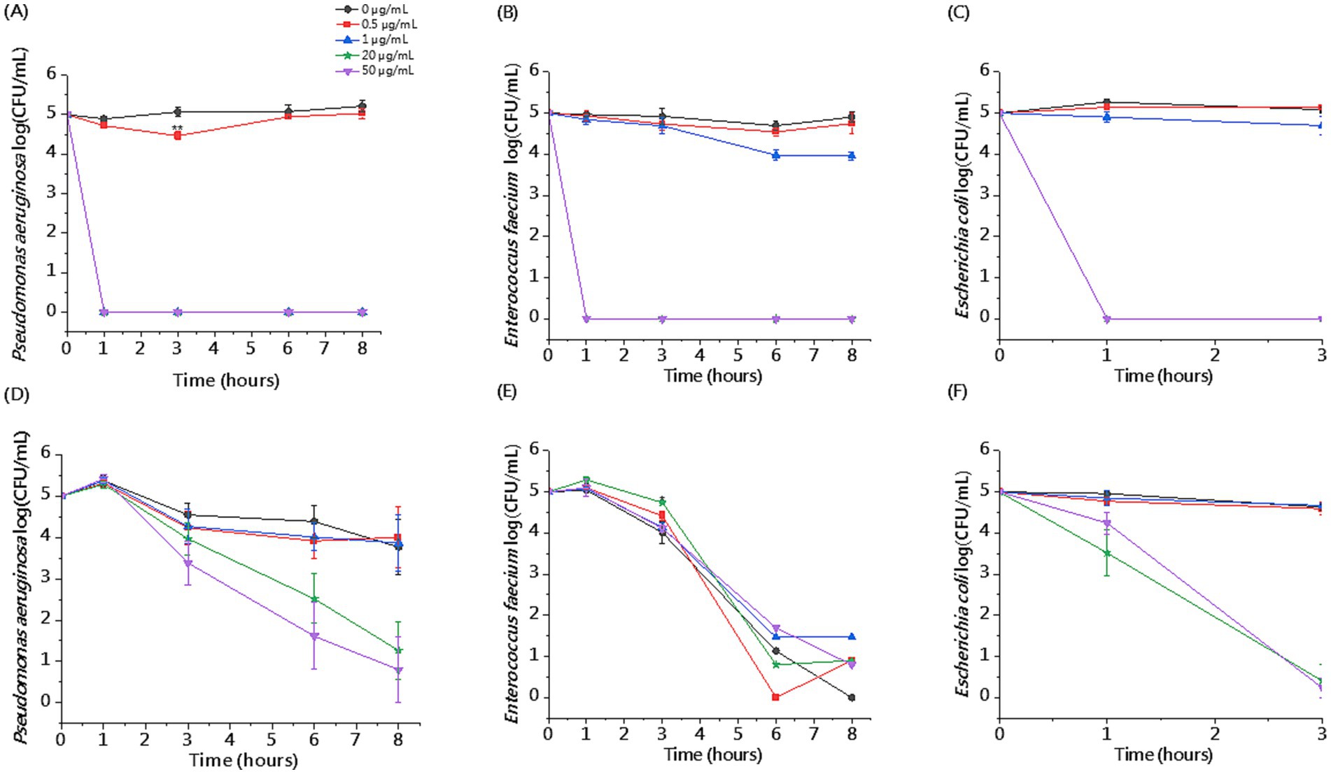 Figure 5. Killing activity of CSA-13 against representative clinical isolates of P. aeruginosa, E. faecium and E. coli at the dose range of 0.5–50 μg/mL in the presence of PBS (A–C) or whole blood (D–F). Results are presented as mean ± SE, n = 3–6 (3 biological replicates/6 technical replicates); * indicates statistical significance compared to an untreated sample, p ≤ 0.05.