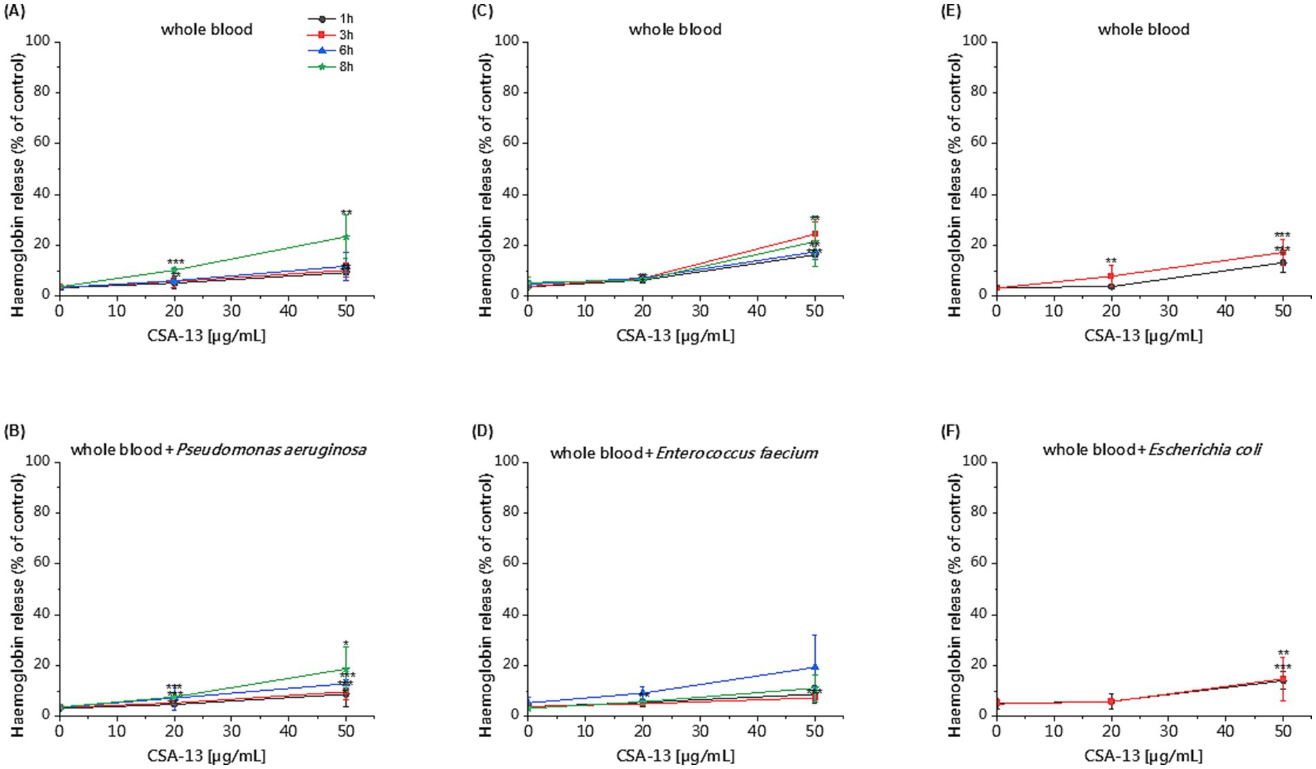 Figure 6. Hemoglobin release after 1, 3, 6 and 8 h of incubation in the presence of CSA-13 at concentrations of 20 and 50 μg/mL in whole blood (A,C,E) and whole blood with P. aeruginosa (B), E. faecium (D) and E. coli (F). The results show: mean ± SD, n = 3–6 (biological replicates); * indicates statistical significance compared to the untreated sample ≤0.05, ** < 0.02 and *** < 0.001.