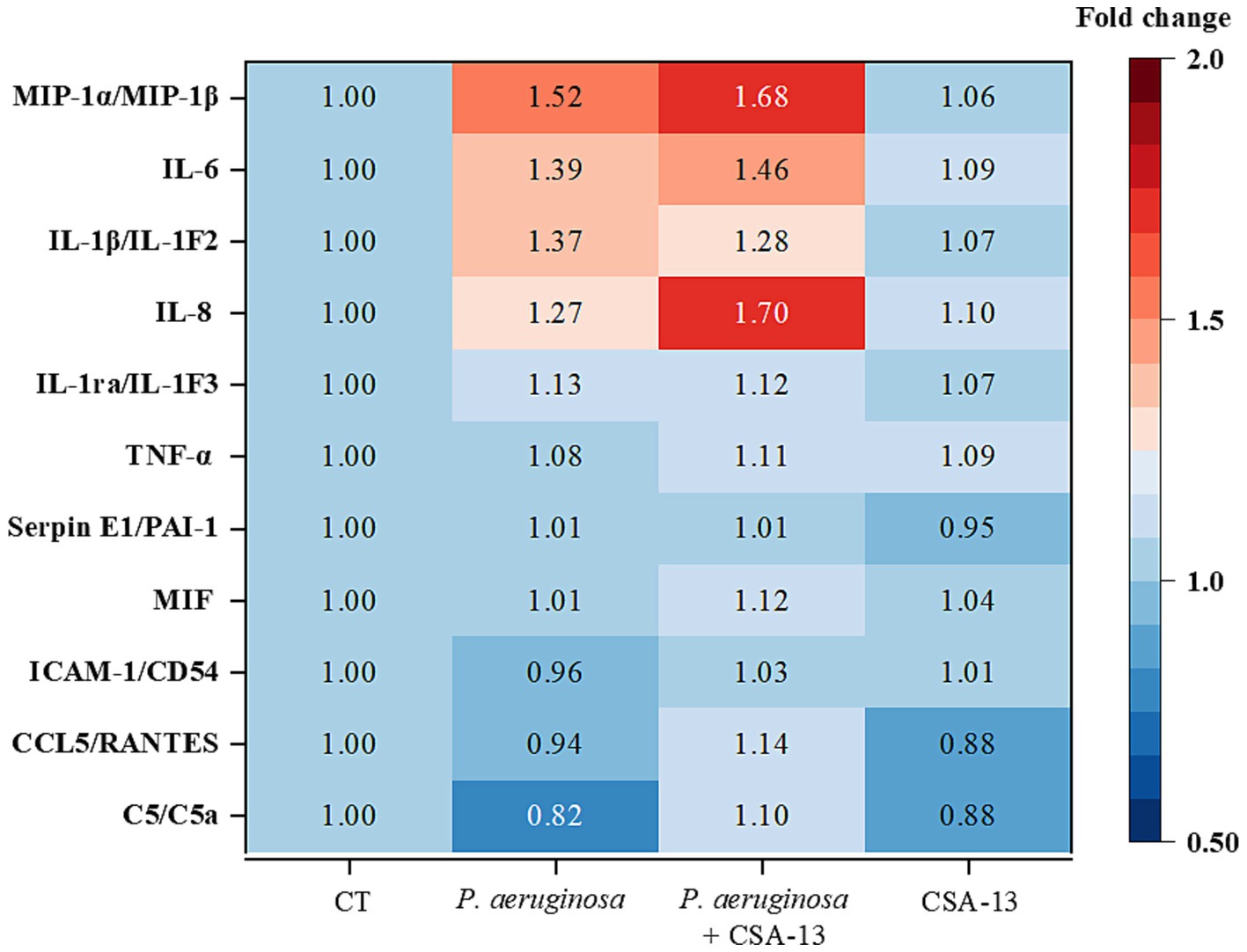 CSA-13 increases the secretion of proinflammatory cytokines, especially interleukin-8 (IL-8), in the presence of P. aeruginosa after 6 h of incubation (Figure 7).
