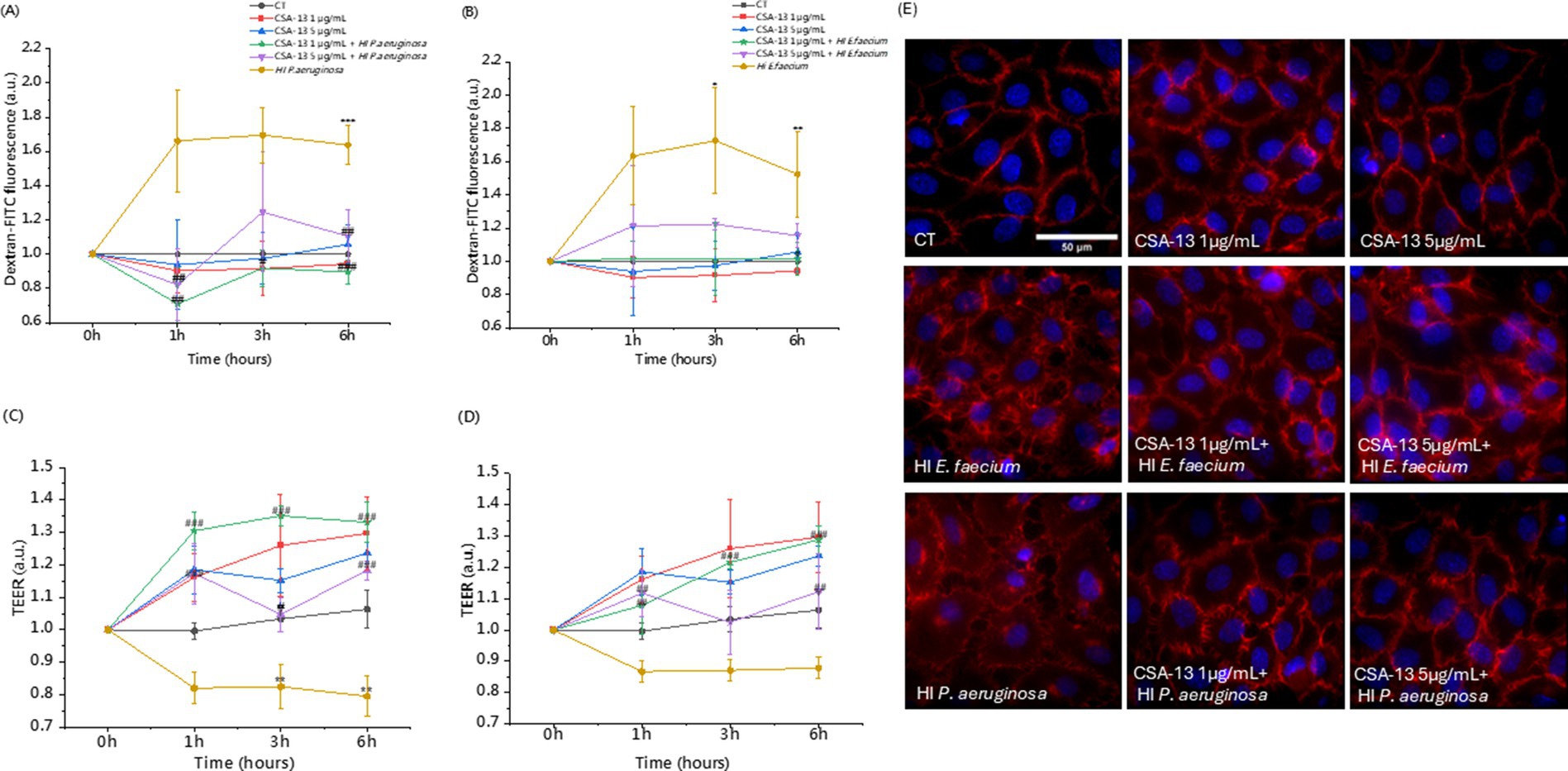 Figure 8. Assessment of the permeability of HUVEC monolayers without and with heat-inactivated bacteria in the presence of CSA-13. Measurements were performed using a fluorometric method based on dextran-FITC permeability (A,B) and transendothelial electrical resistance (TEER) (C,D). The results represent the mean ± SD of three measurements (biological replicates), * and # indicate statistical significance at p ≤ 0.05, ** /## < 0.02 and *** /### < 0.001 compared to CT and heat-inactivated P. aeruginosa (A,C)/heat-inactivated E. faecium (B,D). VE-cadherin (red) rearrangement in response to CSA-13 with the addition of heat-inactivated E. faecium or P. aeruginosa (E), nuclei are in blue.