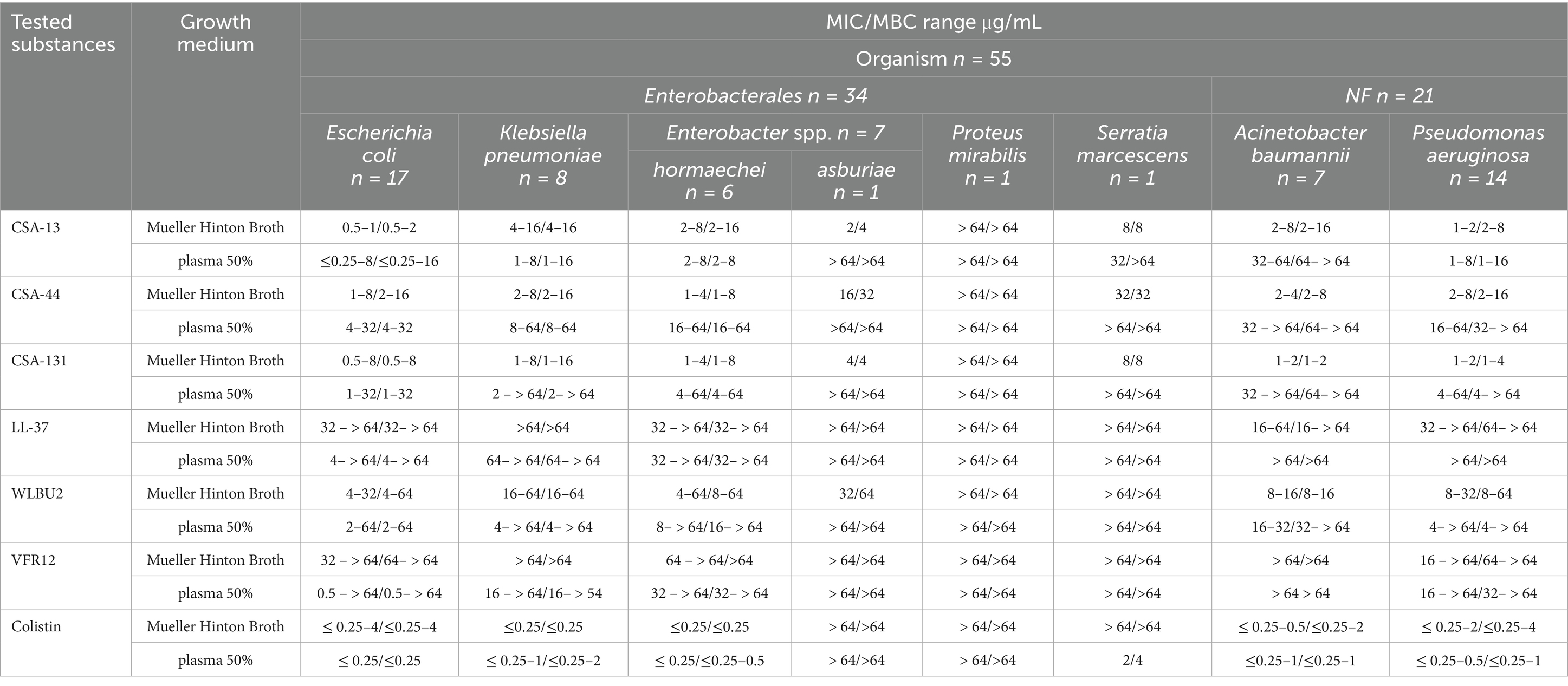Table 1. MIC/MBC range for CSA-13, CSA-44, CSA-131, LL-37, WLBU2, VFR12 and colistin in the presence of Mueller Hinton Broth and 50% human blood plasma for the clinical G (−) bacteria strain.