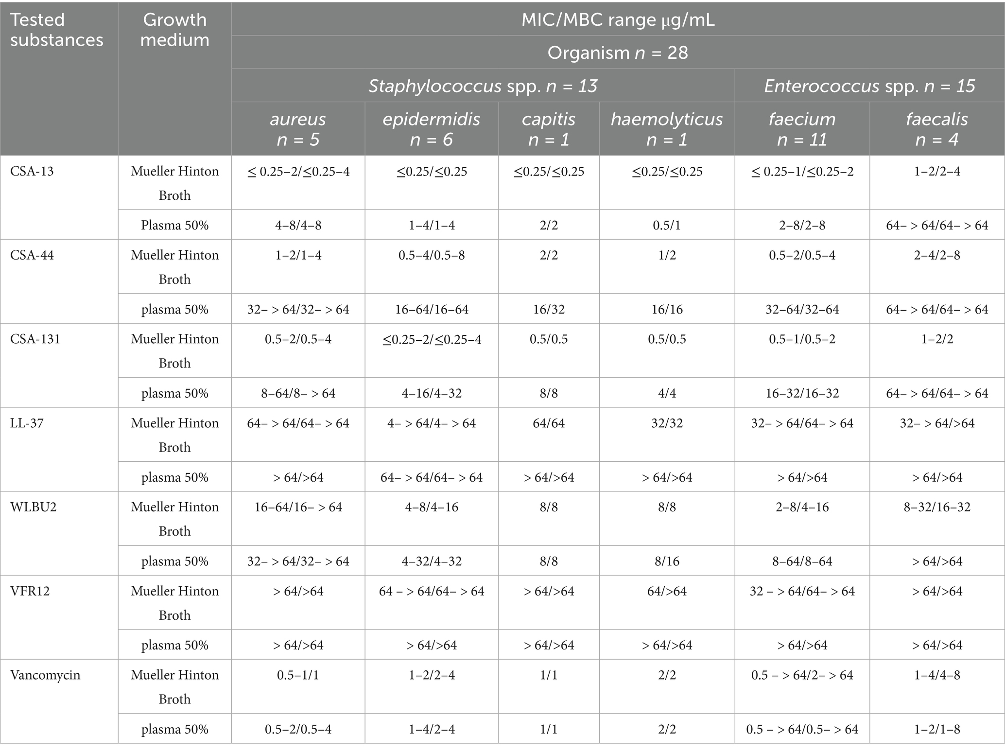 Table 2. MIC/MBC range for CSA-13, CSA-44, CSA-131, LL-37, WLBU2, VFR12 and vancomycin in the presence of Mueller Hinton Broth and 50% human blood plasma for the clinical G (+) bacteria strain.