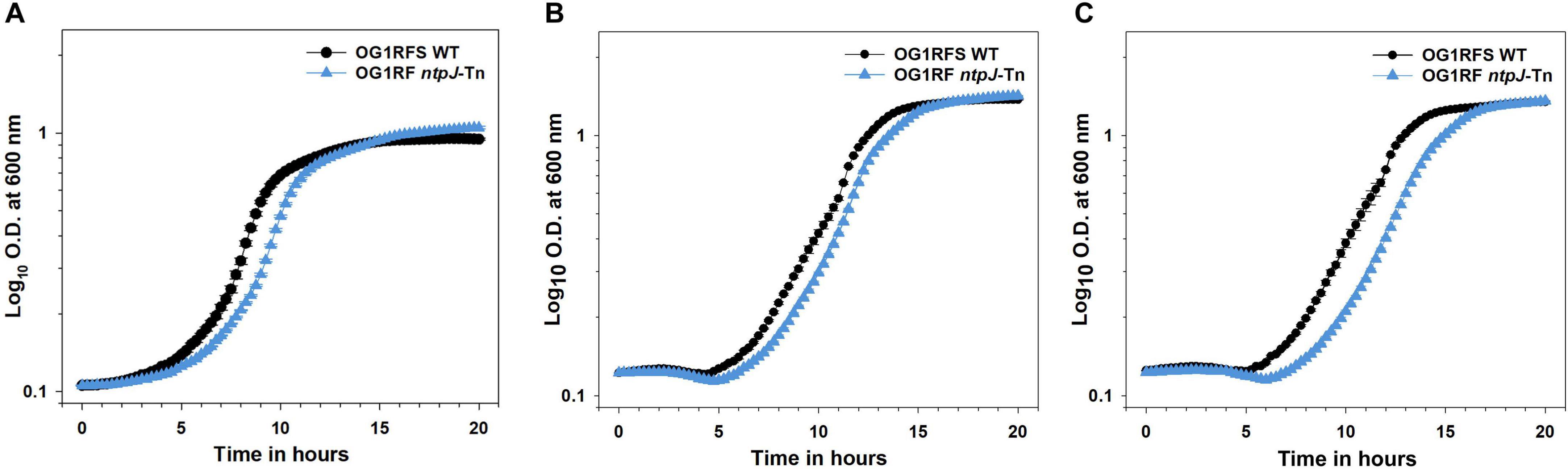 To test the functional role of KtrB (ntpJ) during growth in vitro under neutral conditions, OG1RFS wild type and OG1RF ntpJ-Tn were inoculated into standard YPD (pH 6.8-7) and monitored spectrophotometrically. As shown in Figure 1A and Figure 2A, OG1RF ntpJ-Tn exhibited a significant delay in the progression to mid-log phase relative to the wild-type strain, suggesting the combined K+ influx through KtrD, Kup, and KimA was insufficient to compensate for the loss of KtrB and restore wild-type growth kinetics and supporting a role for KtrB as the primary K+ transporter under K+-limiting conditions. These results are consistent with Acciarri et al., 2023 (Figure 2) in which an E. faecalis JH2-2 derivative (ΔkupΔktrA) experienced a significant growth defect relative to the wild type in mLBG at neutral pH, and align with previous reports detailing that KtrB provides the highest-affinity for K+ influx under neutral conditions, followed by Kup and KimA which provide progressively lower-affinity backup K+ influx (Kawano et al., 2000; Petrezselyova et al., 2011; Gries et al., 2013; Acciarri et al., 2023).