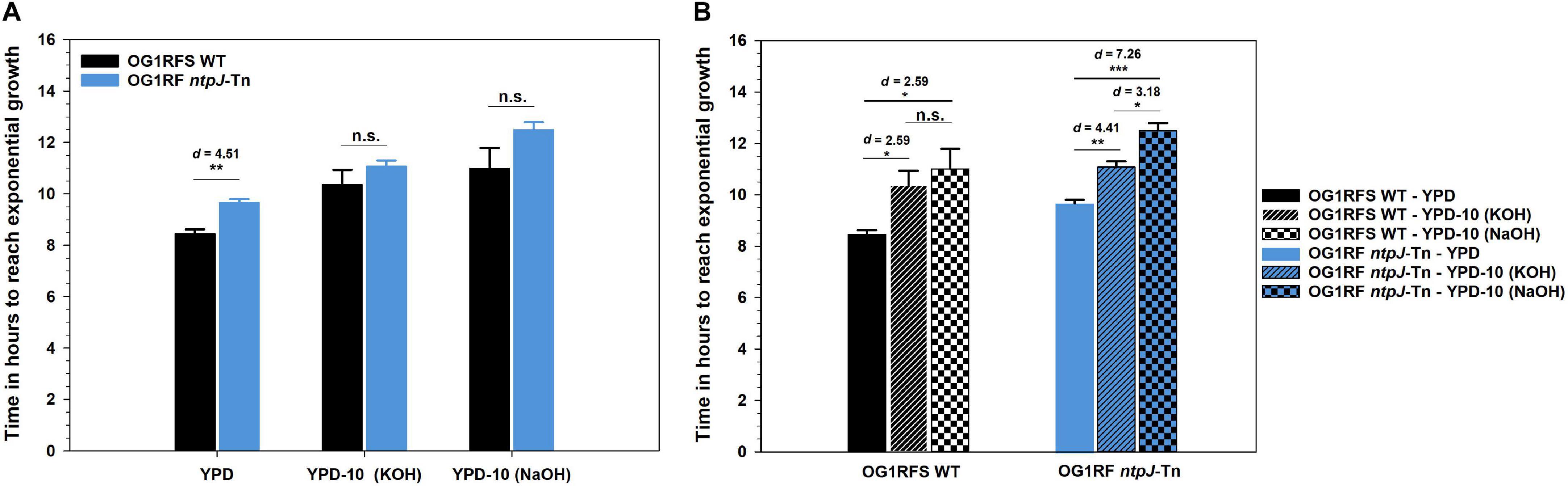 Figure 2. Elapsed time for E. faecalis strains to achieve mid-log phase growth in standard and alkaline-adjusted YPD at 25 °C. (A) Comparison of E. faecalis OG1RFS WT relative to E. faecalis OG1RF ntpJ-Tn; (B) The effects of alkaline-adjusted media on E. faecalis strains. Error bars represent the standard error of the means (*p < 0.05, **p < 0.01, ***p < 0.001; Student’s t-test, d = effect size, n.s. = not significant).
