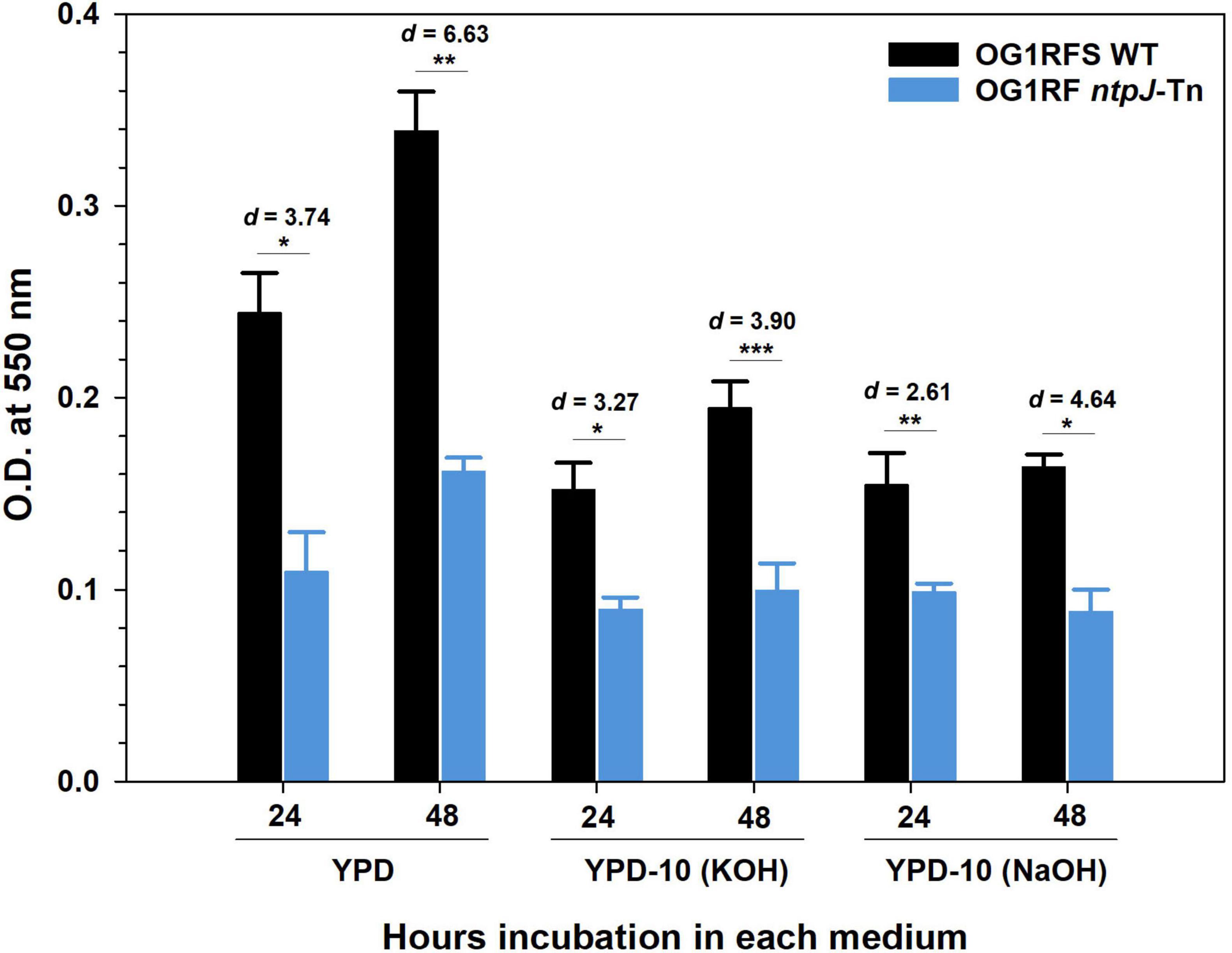Statistically significant differences were analyzed using the Student’s t-test (overall significance level = 0.05). The comparison between the growth of OG1RFS WT in KOH and NaOH failed the Shapiro-Wilk normality test, so we determined a significant difference using the Mann-Whitney Rank Sum test (overall significance level = 0.05). The comparisons between OG1RFS WT and OG1RF ntpJ-Tn biofilm formation in YPD-10 (NaOH) after 24 h, in YPD after 48 h, and the Day 2 comparison during the persistence bioassay failed the Brown-Forsythe equal variance test, so we determined significant differences using Welch’s t-test (overall significance = 0.05). When biofilm data failed the Shapiro-Wilk normality test, we determined statistically significant differences using Mann-Whitney Rank Sum tests (overall significance = 0.05). Data analysis and graph generation were performed using SigmaPlot v.14.0 (Systat, Palo Alto, CA). Effect sizes were calculated in Microsoft Excel as Cohen’s d, defined as the absolute mean difference divided by the pooled standard deviation (Cohen, 1988).