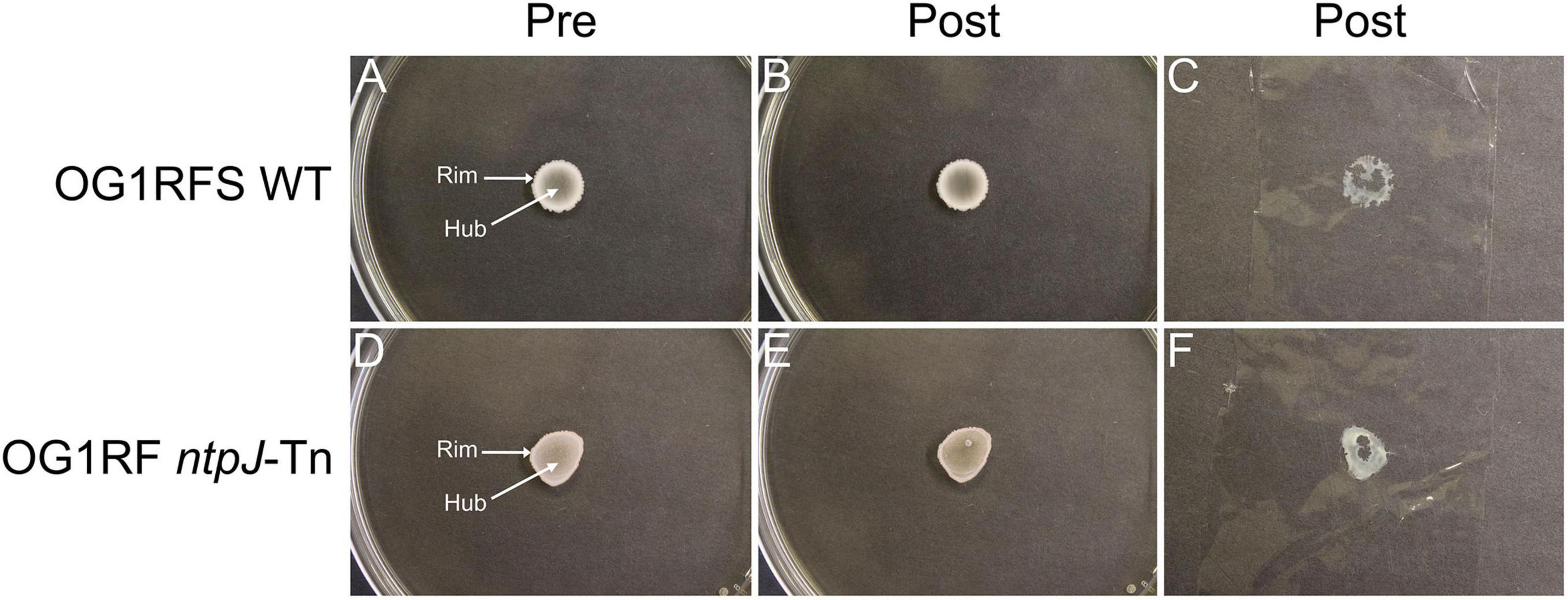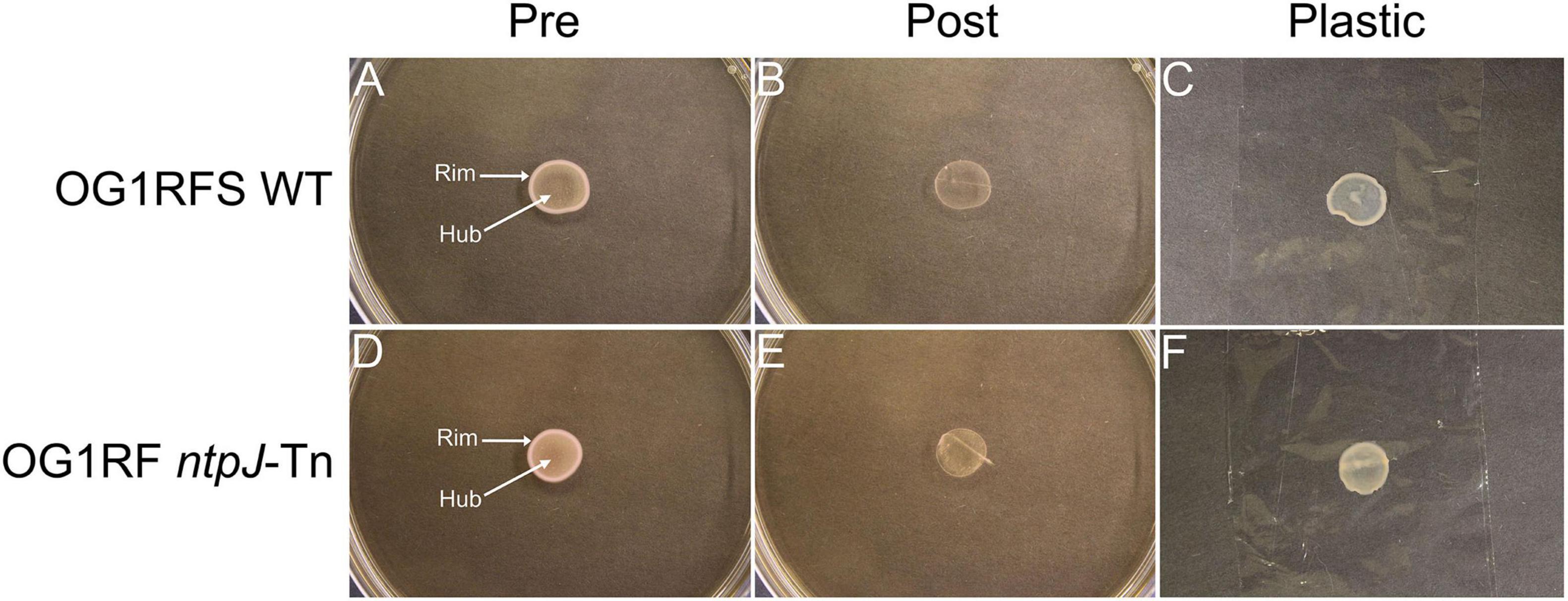 To investigate the influence of growth substrate and pH on biofilm formation and surface adhesion, an overlay adhesion assay was performed with E. faecalis OG1RFS WT and E. faecalis OG1RF ntpJ-Tn biofilms grown on three types of YPD low-density agar: standard (unaltered pH ∼6.8), pH 10 adjusted with KOH, and pH 10 adjusted with NaOH. Both strains formed biofilms of similar circumference with visually more dense regions around the biofilm rim on standard YPD (Figures 4A, D). Following the overlay procedure, both strains showed reduced adherence to the agar surface. The plastic lifted a substantial amount of nonadherent cell biomass in the rim and hub regions, suggesting weak adherence (Figures 4B, C, E, F). When grown on YPD agar adjusted to pH 10 with KOH, both strains formed biofilms with visually enhanced rim cell density compared to biofilms formed on standard YPD agar (Figures 5A, D). Post-overlay, cells in the rim and hub regions of both strains displayed enhanced adhesion to the agar compared to post-overlay cells under standard conditions (Figures 5B, E). A large majority of nonadherent cells lifted with the plastic were from the rim region of both biofilms (Figures 5C, F). In contrast, biofilms grown on YPD low-density adjusted to pH 10 with NaOH, both strains formed biofilms with smaller circumferences compared to those formed on either standard or KOH-adjusted agar (Figures 6A, D). While these biofilms were the smallest in circumference, they showed the strongest adhesion post-overlay, with most of the cells in the rim and hub regions staying attached to the agar (Figures 6B, C, E, F). These results suggest that adhesion was dependent not only on pH but also on the chemical nature of the base used to adjust pH, as NaOH-adjusted conditions promoted the strongest adherence in both strains in a ntpJ-independent manner.
