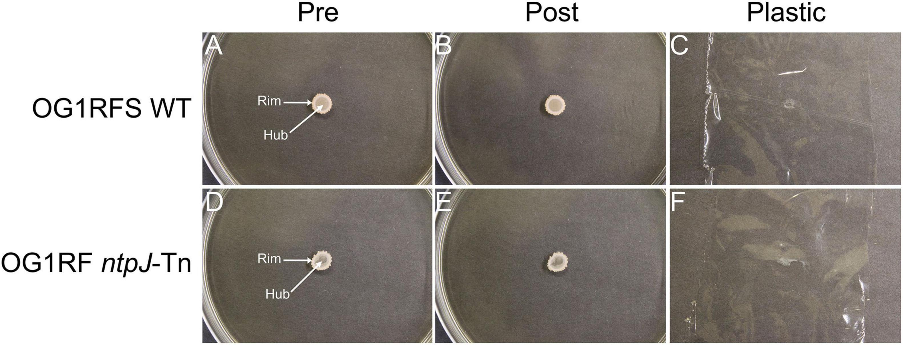 E. faecalis OG1RFS WT and E. faecalis OG1RF ntpJ-Tn were inoculated into 5 mL of YPD media containing the appropriate antibiotics and incubated overnight with shaking at 37° C. To test the adhesive properties of the strains, we followed a previously described method with slight modifications (Reynolds et al., 2008). Twenty microliters of stationary phase cultures were pipetted onto the surface of YPD low-density (0.3% [wt./vol.]) alkaline-adjusted agar plates and incubated for 5 days at 25° C in an Air Jacketed CO2 incubator (VWR, Radnor, PA). A rectangular piece of commercial plastic wrap (Great Value, Bentonville, AR) was carefully placed over the bacterial colony, allowing it to adhere to the surface by capillary action. Sufficient excess plastic was left on both sides to enable removal without disturbing the agar. After 10 s, the plastic was gently and evenly lifted from both sides, inverted, and placed on an 8” × 11.5” laminated piece of black construction paper for imaging using a Canon EOS Rebel Tx Digital SLR Camera (Canon, Tokyo, JP) to capture the distribution of non-adherent cells. Images of the cells remaining on the agar surface were captured to document the adherent population.