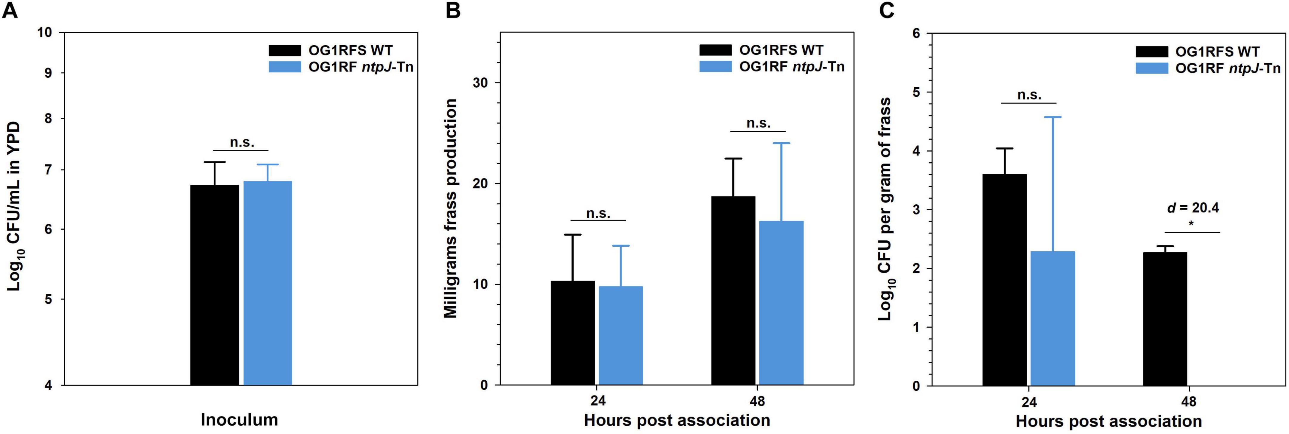 The association of OG1RFS WT and OG1RF ntpJ-Tn with H. zea larvae was performed as previously described (Jackson et al., 2024). Briefly, on day seven post-eclosion, larvae were fasted overnight, and OG1RFS WT and OG1RF ntpJ-Tn were each inoculated into 5 mL standard YPD with antibiotics and grown overnight as described previously. The next day, 1 mL of each stationary phase culture was pelleted by centrifugation (17,000 × g for 5 min.) at room temperature in an AccuSpin Micro 17R Microcentrifuge (ThermoFisher, Waltham, MA) then washed once in sterile phosphate-buffered saline (PBS, 137 mM NaCl, 2.7 mM KCl, 10 mM Na2HPO4, 1.8 mM KH2PO4) pH 7.4. Pellets were resuspended in 1 mL PBS (Tube 1: ∼109 CFU mL–1), followed by the transfer of 100 μL to a new tube containing 900 microliters of PBS (Tube 2: ∼108 CFU mL–1). One hundred microliters of each strain were added to 900 microliters of PBS (∼107 CFU mL–1). One hundred microliters of each strain were pipetted onto the surface of general-purpose lepidopteran diet, which had been amended with 50 μg mL–1 rifampicin and previously dispensed into 128-well bioassay trays (Frontier Agricultural Sciences, Newark, DE). After gently swirling to evenly coat the diet surface with bacteria, the bioassay trays were dried for ∼4 h. in a Purifier Logic+ Class II Biosafety Cabinet. After drying, three fasted larvae were transferred to diet surface contaminated with each strain (one larva per well), after which the trays were covered with ventilated adhesive seals (Frontier, Newark, DE) and incubated in a growth chamber under the previously described standard rearing conditions. The density of each strain applied to the diet was estimated by plating on selective media and recorded (CFU mL–1). Larvae were transferred to fresh diet amended with 50 μg mL–1 rifampicin in 1.25 oz. plastic cups (Frontier, Newark, DE) at twenty-four and forty-eight-hours post-association using sterile forceps and without disturbing frass (feces) and returned to the growth chamber. Frass from each larva remaining in the bioassay tray and the 1.25 oz. plastic cups was transferred using sterile blunt-end forceps into an autoclaved low-retention microcentrifuge tube (ThermoFisher, Waltham, MA), and weighed using an OHAUS Analytical Balance (OHAUS, Parsippany, NJ). Each frass sample was diluted in sterile PBS (1:10 [wt./vol.]) and vortexed for 10 s every 15 min. for one hour to liberate bacteria. The top soluble portion of each frass homogenate was then serially diluted in sterile PBS (1:10 [vol./vol.]), and 100 μL was spread using autoclaved borosilicate glass beads (ThermoFisher, Waltham, MA) on YPD agar plates containing rifampicin and streptomycin for OG1RFS WT or rifampicin and chloramphenicol for OG1RF ntpJ-Tn. Plates were incubated at 37 °C for 24–48 h before CFUs were counted. The log-transformed viable counts of each strain were reported as the average log10 CFU per gram of frass. The experiment was repeated in triplicate.