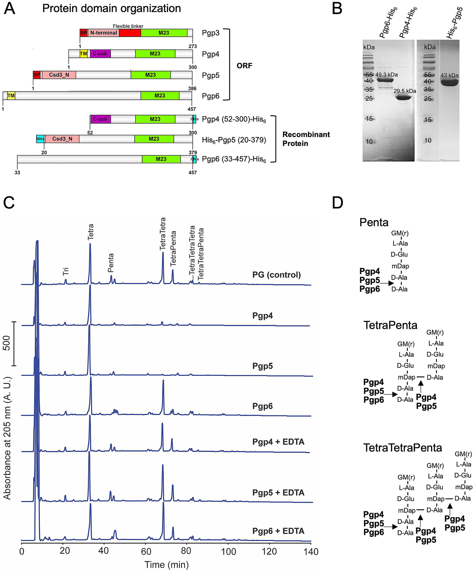 In vitro DD-EPase and DD-CPase activity of Pgp4 and Pgp5, and DD-CPase activity of Pgp6. (A) protein domain organization of C. jejuni M23 peptidases Pgp3, Pgp4, Pgp5 and Pgp6 and the recombinant proteins used for protein expression and purification. The Pgp4, Pgp5, and Pgp6 domains were predicated by jackhammr (Frirdich et al., 2023) and Pgp3 domains were assigned based on the available crystal structure (Min et al., 2020). (B) Purified recombinant Pgp4, Pgp5 and Pgp6 proteins separated on 12% SDS-PAGE and stained with Coomassie Brilliant Blue. The predicted molecular weight of each protein is indicated above the band. (C) HPLC chromatograms of E. coli D456 PG incubated with purified Pgp4, Pgp5 and Pgp6 with and without EDTA. E. coli D456 PG alone was used as a control. (D) Schematic diagram of the muropeptide substrates and the Pgp4, Pgp5 and Pgp6 cleavage sites indicated with arrows. G, N-acetylglucosamine; M(r), reduced N-acetylmuramic acid; L-Ala, L-alanine; D-Glu, D-glutamic acid; mDAP, meso-diaminopimelic acid; D-Ala, D-alanine.