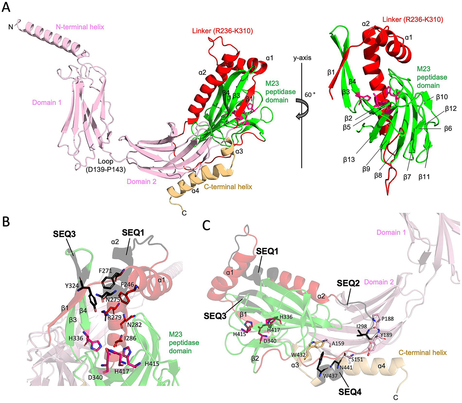 The AlphaFold model of Pgp6 and insertion sequences (SEQ1-SEQ4). (A) Ribbon diagram of the Pgp6 AlphaFold model. The N-terminal helix, domain 1, and domain 2 are shown in pink, the linker between domain 2 and M23 peptidase domain in red, the M23 peptidase domain in green, and the C-terminal helix in light orange. Residues of the Zn binding motif (H336, D340, H415, and His417) are shown in stick format. The secondary structure elements of the linker and M23 peptidase domain are labeled. (B) Zoomed in view of insertion sequences SEQ1 and SEQ3. The insertion sequences are shown in black. Side chains of residues in the consensus sequence Fx3Nx3Rx2Nx3I (F271, N275, R279, N282, and I286) are facing toward the catalytic Zn binding motif. Aromatic residues F271 in SEQ1 and Y324 in SEQ3 cluster with a conserved residue F246. (C) Diagram of the partial Pgp6 model showing that SEQ2 and SEQ4 form contacts that anchor the M23 peptidase domain to domain 2. The I298 residue in SEQ2 is hydrogen bonded to the main chain of P188 and Y189; N441 in SEQ4 is hydrogen bonded to the hydroxyl group of S151; and W437 in SEQ4 forms a hydrophobic core with residues W432 and A159. Hydrogen bonds are indicated as dash lines.