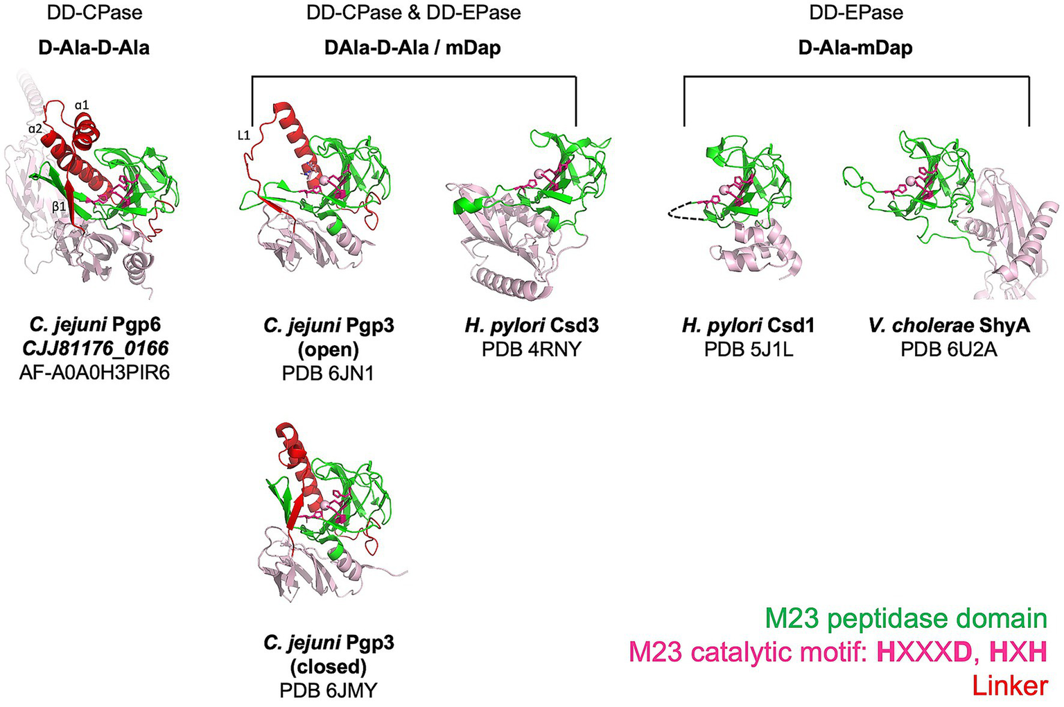 Comparison of M23 peptidase domain proteins with different PG substrates. Ribbon diagrams showing the architecture of M23 peptidase domains from enzymes that cleave the terminal D-Ala of pentapeptide side chains and/or the 4-3 cross-links. Pgp6 is a predicted structure retrieved from the AlphaFold database. C. jejuni Pgp3 (Min et al., 2020), H. pylori Csd3 (An et al., 2015), H. pylori Csd1 (An et al., 2016), and V. cholerae ShyA (Shin et al., 2020) are experimental structures obtained by X-ray crystallography. The M23 peptidase domain is shown in green, the linker that connects the N-terminal region and the M23 peptidase domain in red, and the remainder of the model in pink. The zinc coordinating residues are shown as stick models, and the zinc metal ion, if available, is drawn as a sphere. The functional activity and the identity of the amino acids of the peptide substrate of each enzyme are written above the enzyme models. Note the functional activity of Csd1 was determined from the muropeptide profile of the mutant and not by biochemical activity assay.