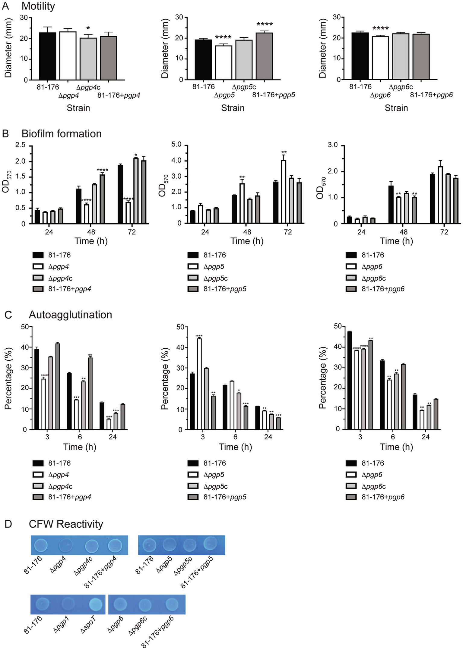 The effect of pgp4, pgp5 and pgp6 on motility, biofilm formation, autoagglutination and CFW reactivity. The phenotypic properties of the pgp4, pgp5 and pgp6 mutant, complemented (∆pgp4c, ∆pgp5c, and ∆pgp6c) and overexpression (81–176 + pgp4, 81–176 + pgp5 and 81–176 + pgp6) strains were assessed. (A) Motility assayed by measuring halo diameters in soft agar plates. S.E. (error bars) was calculated from 10 technical replicates. Statistical significance was determined using a one-way ANOVA with a Dunnett’s test for multiple comparisons. Data was representative of three independent experiments (B) biofilm formation assessed by crystal violet staining of standing cultures in borosilicate tubes and quantification of dissolved crystal violet at 570 nm. S.E. values were calculated from triplicate cultures and are representative of three independent experiments. Statistical significance was determined using a two-way ANOVA with a Dunnett’s test for multiple comparisons. (C) Autoagglutination was measured at 0, 3, 6, and 24 h in PBS at 25°C. The data was normalized with the OD600 at t = 0 representing 100% and the OD600 at each timepoint calculated as a percentage of that at t = 0. A decrease in percentage represents an increase in autoagglutination. S. E. values were calculated from triplicate cultures and are representative of three independent experiments. Statistical significance was determined using a two-way ANOVA with a Dunnett’s test for multiple comparisons. (D) The fluorescence relative to wild type after 48 h of growth on plates containing 0.002% CFW. The controls included ∆spoT and ∆pgp1 representing a hyperfluorescent and hypofluorescent strain, respectively. Note that in the bottom row, all strains are compared to the wild type shown in the first panel of that row as both panels are cropped from the same image. The asterisk (*) indicates a statistically significant difference in comparison to wild type, with *, **, ***, or *** indicating p < 0.05, p < 0.01, p < 0.001 and p < 0.0001, respectively.
