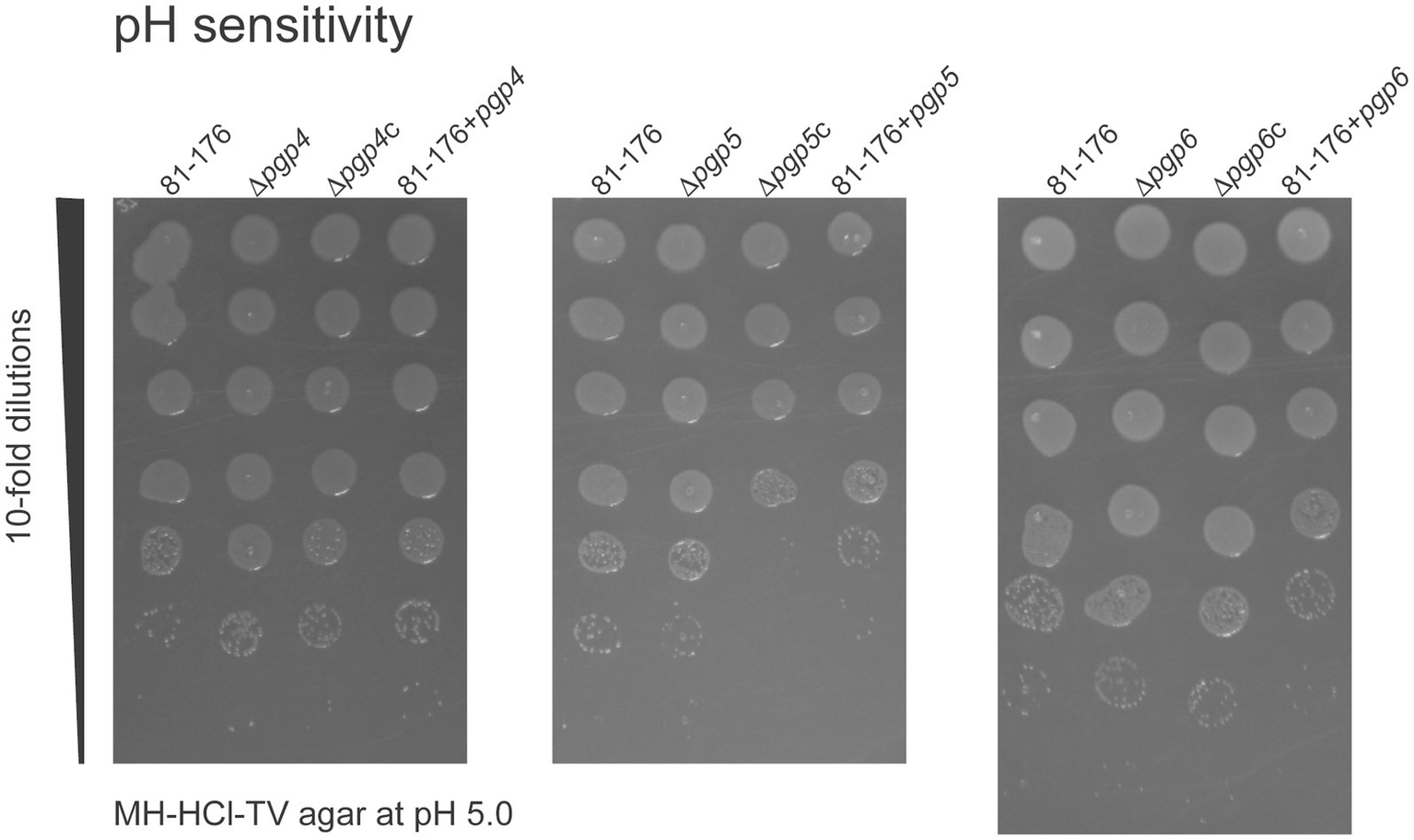 The effect of pgp4, pgp5 and pgp6 on acid survival. The ability of the pgp4, pgp5 and pgp6 mutant, complemented (∆pgp4c, ∆pgp5c, and ∆pgp6c) and overexpression (81–176 + pgp4, 81–176 + pgp5 and 81–176 + pgp6) strains to grow on MH-HCl-TV agar at pH 4.5, 5.0, 5.5, 6.0, 6.5, 7.0 and MH-TV unadjusted for pH was assessed. Only growth on pH 5.0 showed differences in comparison to wild type and is shown here. Overnight cultures were standardized to an OD600 of 0.50 OD/mL and serially diluted 10-fold in MH-TV broth in a microtiter plate. 5 μL of each dilution was spot plated with the most concentrated at the top of the plate. The MH-HCl-TV plates were incubated for 2 days at 37°C under microaerophilic conditions to assess growth at each dilution. The data presented is representative of three independent experiments.
