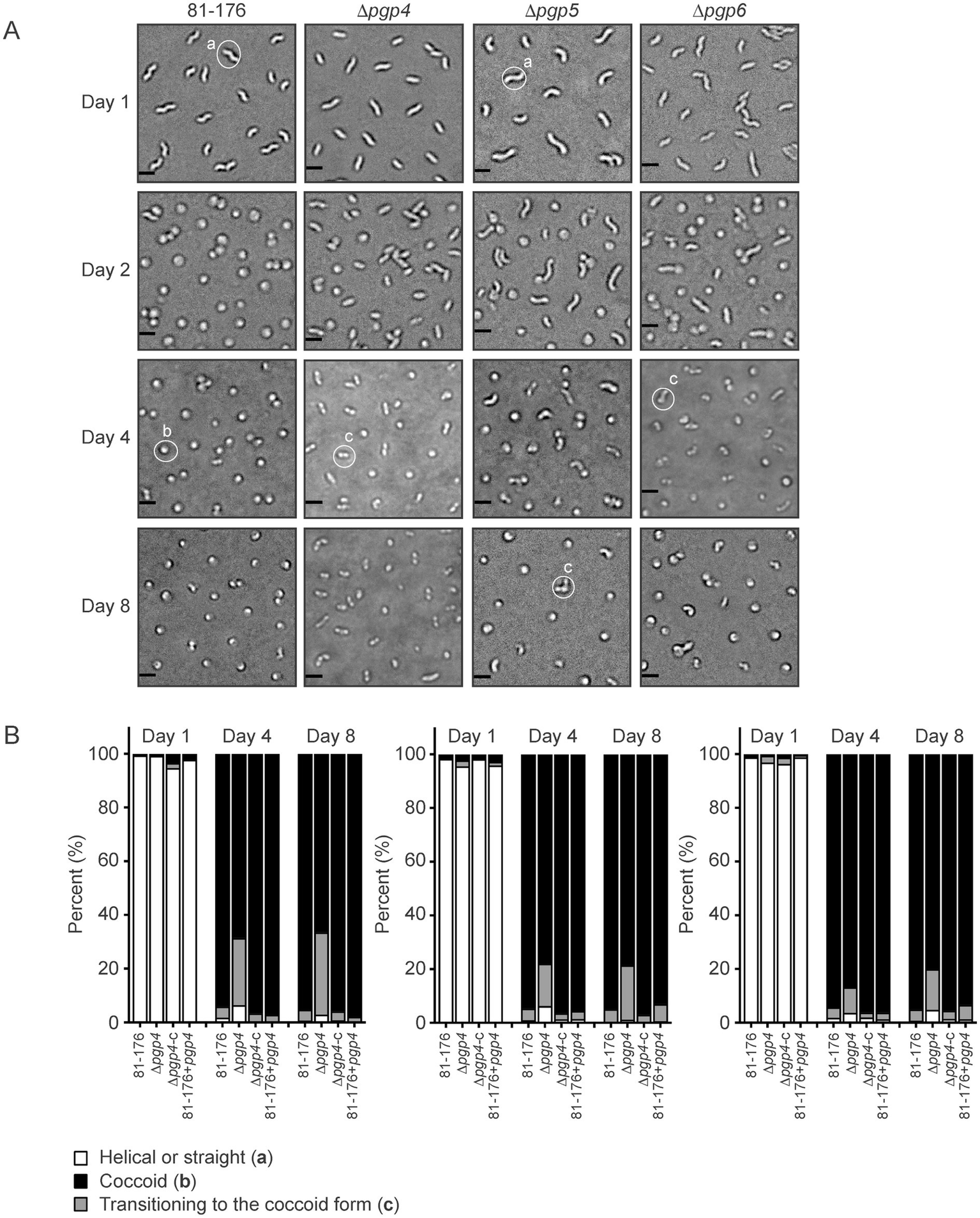 The effect of pgp4, pgp5 and pgp6 on the transition to the coccoid form. (A) DIC microscope images of C. jejuni wild type 81–176, ∆pgp4, ∆pgp5 and ∆pgp6 mutant strains grown on solid media at 37°C to follow the transition to the coccoid form over time. Representative cells considered to be helical, coccoid or transitioning to the coccoid form are indicated by a, b or c, respectively. (B) The percentage of helical, coccoid and cells transitioning to the coccoid form as determined from DIC images such as those shown in (A) of the pgp4, pgp5 and pgp6 mutant, complemented (∆pgp4c, ∆pgp5c, and ∆pgp6c) and overexpression (81-176+pgp4, 81-176+pgp5, and 81-176+pgp6) strains. At least three separate fields of view of approximately 100–200 bacteria were counted for each strain at each timepoint and this was carried out in triplicate.