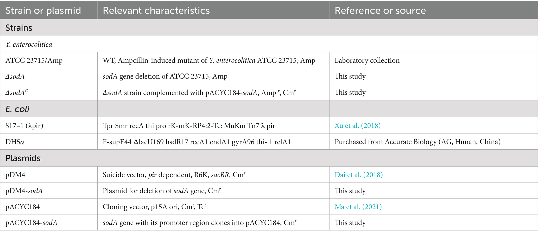 Y. enterocolitica primarily infects the terminal ileum and proximal colon. Upon entering the host, the bacterium expresses the virulent pYV gene and secretes virulence factors, enabling colonization in the intestine and adhesion to intestinal epithelial cells (Bhunia, 2008). To successfully infect and invade the host, the pathogen must overcome the first line of host defense-phagocytosis by neutrophils and macrophages. Phagocytes generate reactive oxygen species (ROS) through respiratory bursts in response to pathogenic stimulation (Tang et al., 2012). The production of superoxide dismutase (SOD), encoded by the sodA gene, reduces superoxide anions, neutralizing the bactericidal effects of ROS. SOD functions as a virulence factor in certain pathogens, attenuating the oxidative burst effects of phagocytes (Tang et al., 2012). SODs have been implicated in survival and pathogenicity within phagocytes across multiple pathogens (Maurya and Namdeo, 2021). The study by Fu et al. (2014) confirmed that SODs, particularly copper-dependent SOD, helps pathogens (such as Escherichia coli, Salmonella, Mycobacterium tuberculosis, and Streptococcus pneumoniae) resist reactive oxygen species (ROS) toxicity induced by the host, thereby enhancing bacterial survival and pathogenicity. The study by Cavinato et al. (2020) demonstrates that SODB in Pseudomonas aeruginosa contributes to the production of lethal hydrogen peroxide early in infection, enhancing bacterial survival. However, in the later stages of infection, its role shifts to promoting bacterial survival, possibly through the activation of autophagy. Troxell et al. (2012) provided evidence that the SodA of Borrelia burgdorferi is a manganese-dependent superoxide dismutase, and that this enzyme helps the bacterium resist the accumulation of endogenous superoxide, enhancing its survival within the host. The creation of gene knockout mutants is essential for functional genomics studies in bacteria. Homologous recombination technology is commonly used to create gene knockout mutants, where exogenous DNA containing an antibiotic selection marker recombines with the homologous sequence of the target gene in the recipient cell’s chromosome (Tong et al., 2023). Gibson assembly is a seamless, efficient cloning method that allows the directional insertion of up to six DNA fragments into any vector site without requiring restriction sites. It boasts a high success rate, often yielding correct clones in a single attempt (Gibson et al., 2009). The sodA gene encodes an antioxidant enzyme (Mn-SOD), which helps the cell eliminate superoxide radicals and reduces oxidative stress-induced damage (Chiang and Schellhorn, 2012). However, the role of the sodA gene in Y. enterocolitica has not been systematically reported.