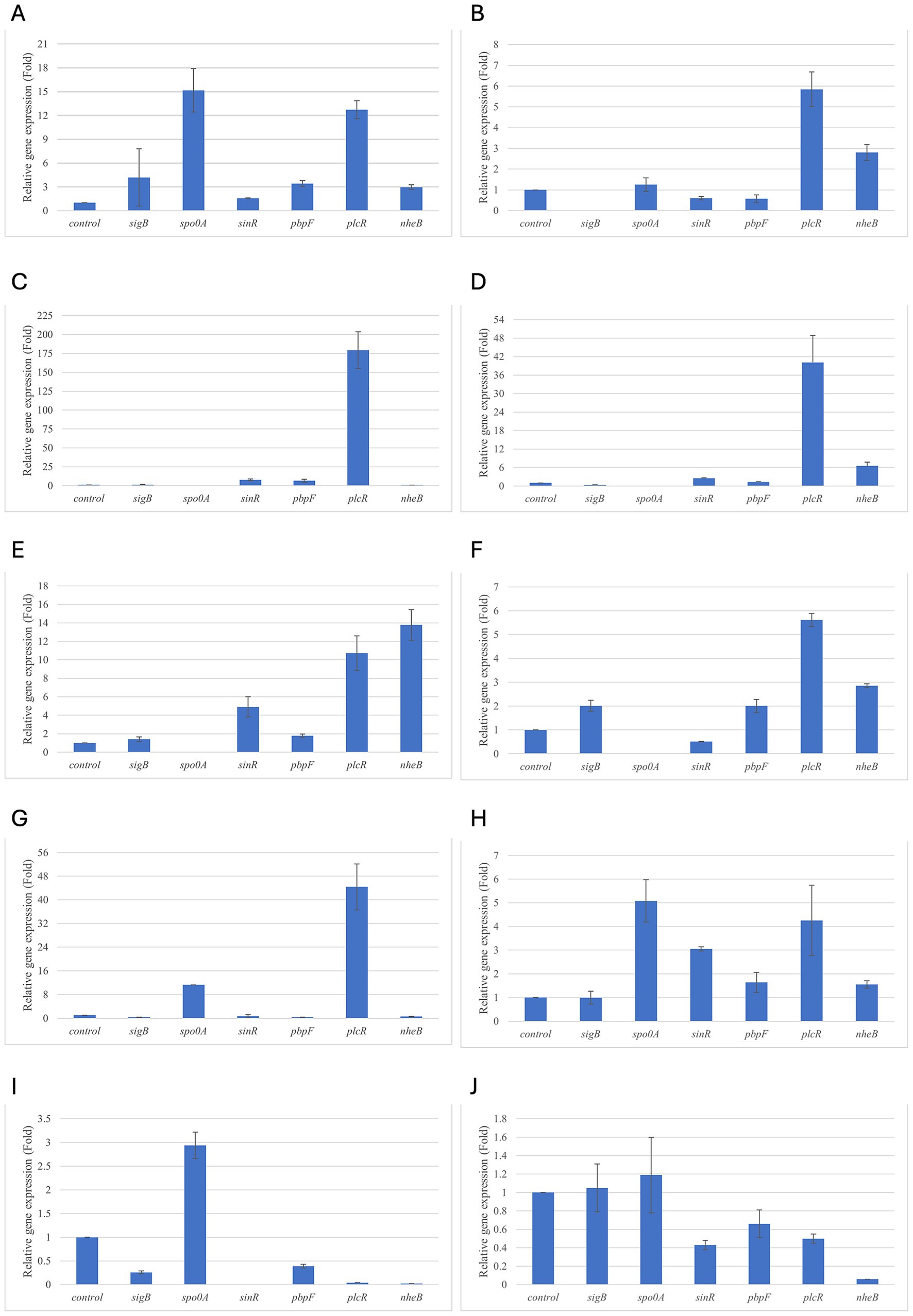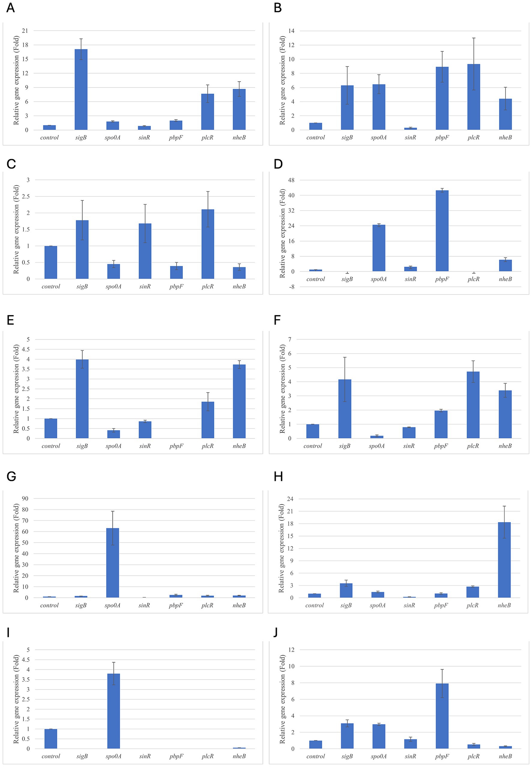 Figure 1. Relative gene expression of B. cereus strain 11 at various exposure durations to Thymus vulgaris EO. (A) 0.58 mg/mL for 48 h, (B) 0.29 mg/mL for 48 h, (C) 0.58 mg/mL for 24 h, (D) 0.29 mg/mL for 24 h, (E) 0.58 mg/mL for 18 h, (F) 0.29 mg/mL for 18 h, (G) 0.58 mg/mL for 12 h, (H) 0.29 mg/mL for 12 h, (I) 0.58 mg/mL for 6 h, (J) 0.29 mg/mL for 6 h. Bars depict the mean of three replicates, with error bars showing standard deviation.