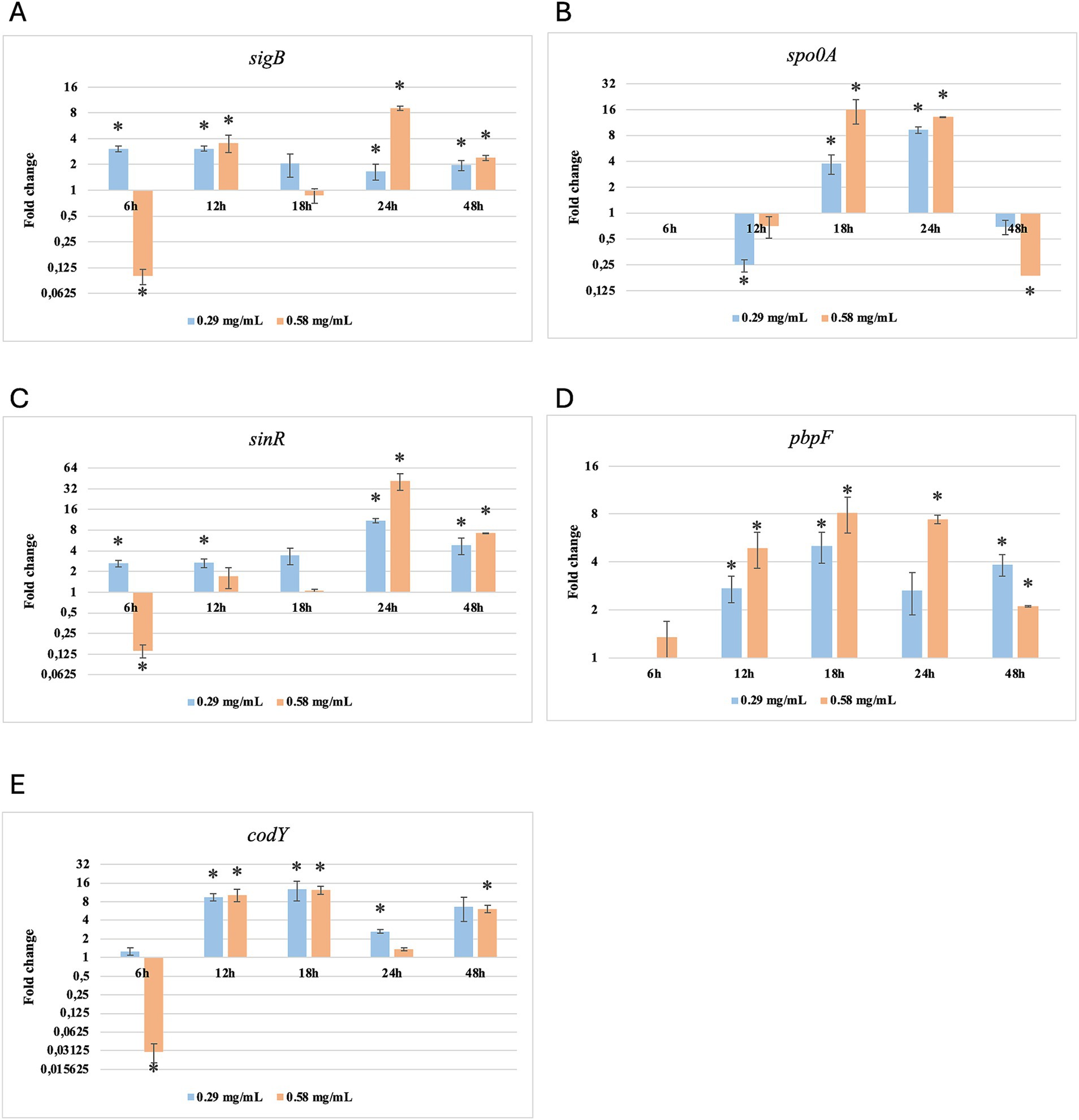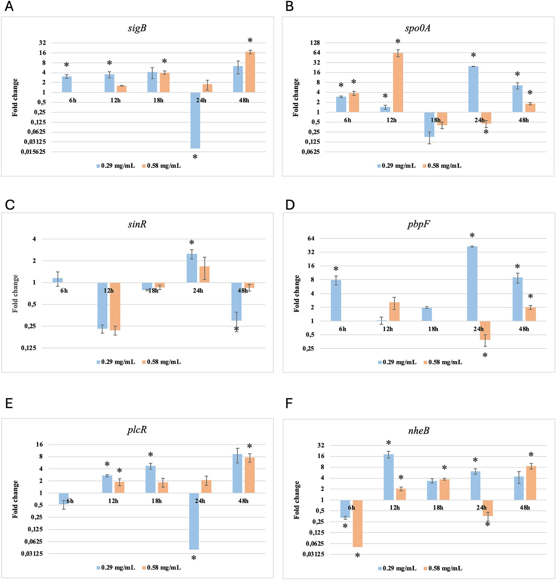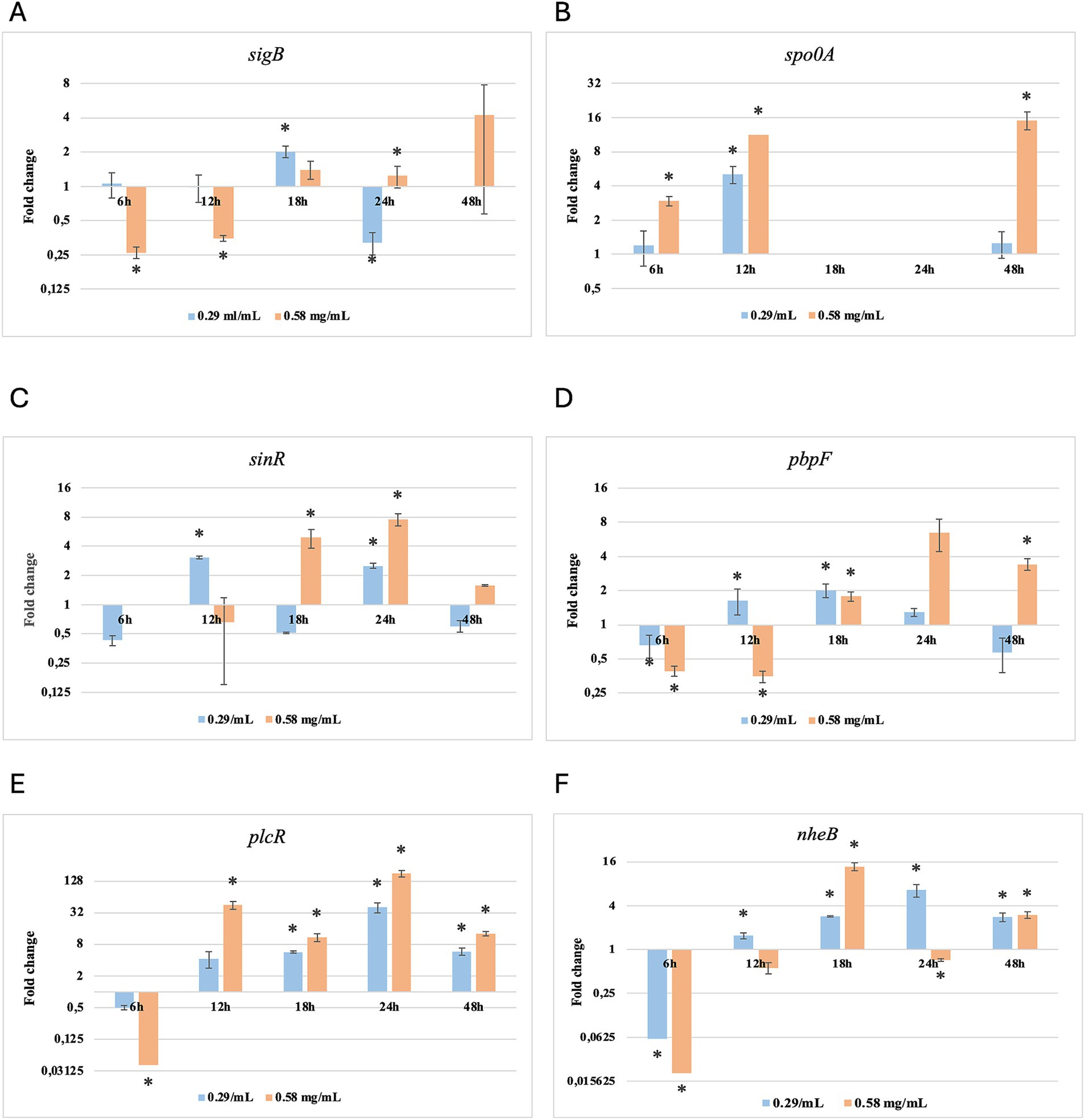 While for the most significant part of the genes there was no evident difference between the expression at the two concentrations tested, for other genes (plcR, spo0A, sinR) T. vulgaris EO determined a more significant overexpression at the concentration of 0.58 mg/mL, as indicated by the fold change (Figures 3B,C,E). In contrast, O. vulgare EO was more stimulating at 0.29 mg/mL for the other genes, particularly pbpF (Figure 4D).