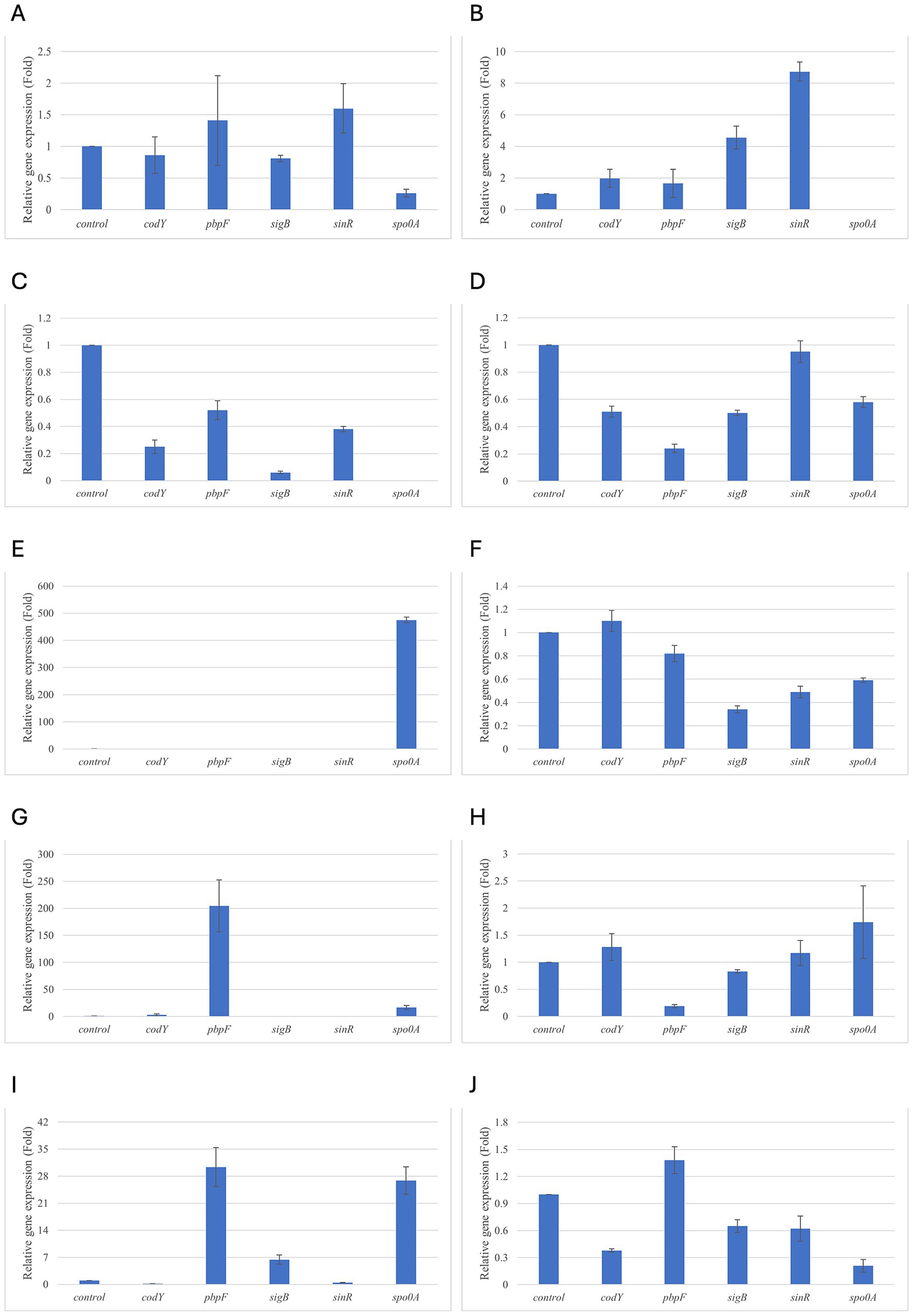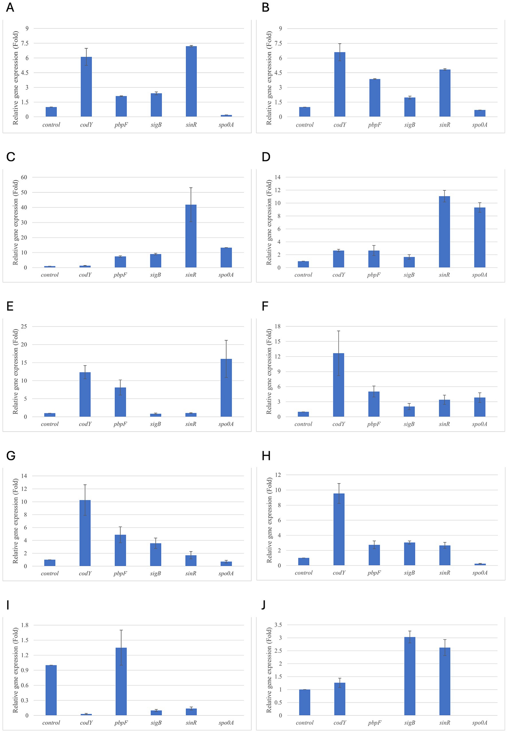 Figure 6. Relative gene expression of B. subtilis strain 58C at various exposure durations to Origanum vulgare EO. (A) 0.58 mg/mL for 48 h, (B) 0.29 mg/mL for 48 h, (C) 0.58 mg/mL for 24 h, (D) 0.29 mg/mL for 24 h, (E) 0.58 mg/mL for 18 h, (F) 0.29 mg/mL for 18 h, (G) 0.58 mg/mL for 12 h, (H) 0.29 mg/mL for 12 h, (I) 0.58 mg/mL for 6 h, (J) 0.29 mg/mL for 6 h. Bars depict the mean of three replicates, with error bars showing standard deviation.