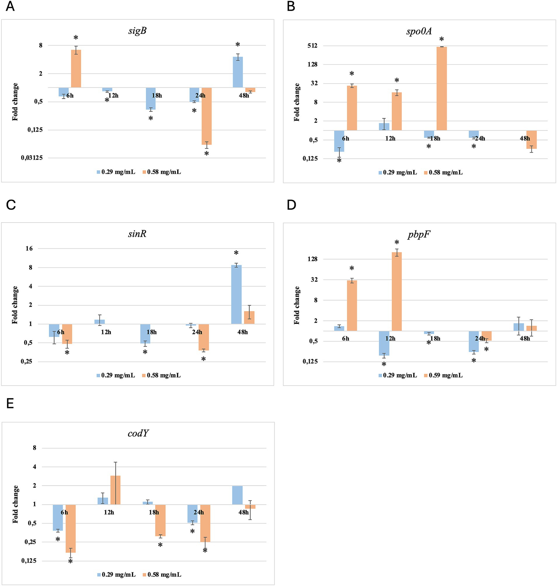 The codY gene regulates over two hundred B. subtilis genes (Barbieri et al., 2015). During our observation, codY and sinR remained predominantly down-regulated (p < 0.05), and began to be significantly upregulated after 24 h for O. vulgare EO and 48 h for T. vulgaris EO treatments. These genes regulate the promotion of mobility, flagella expression, and biofilm control (Jin et al., 2021). Some of these functions overlap with those of the spo0A gene; however, the latter is more involved in the initiation of sporulation, which appears to play a significant role in stress response (Xu et al., 2017).