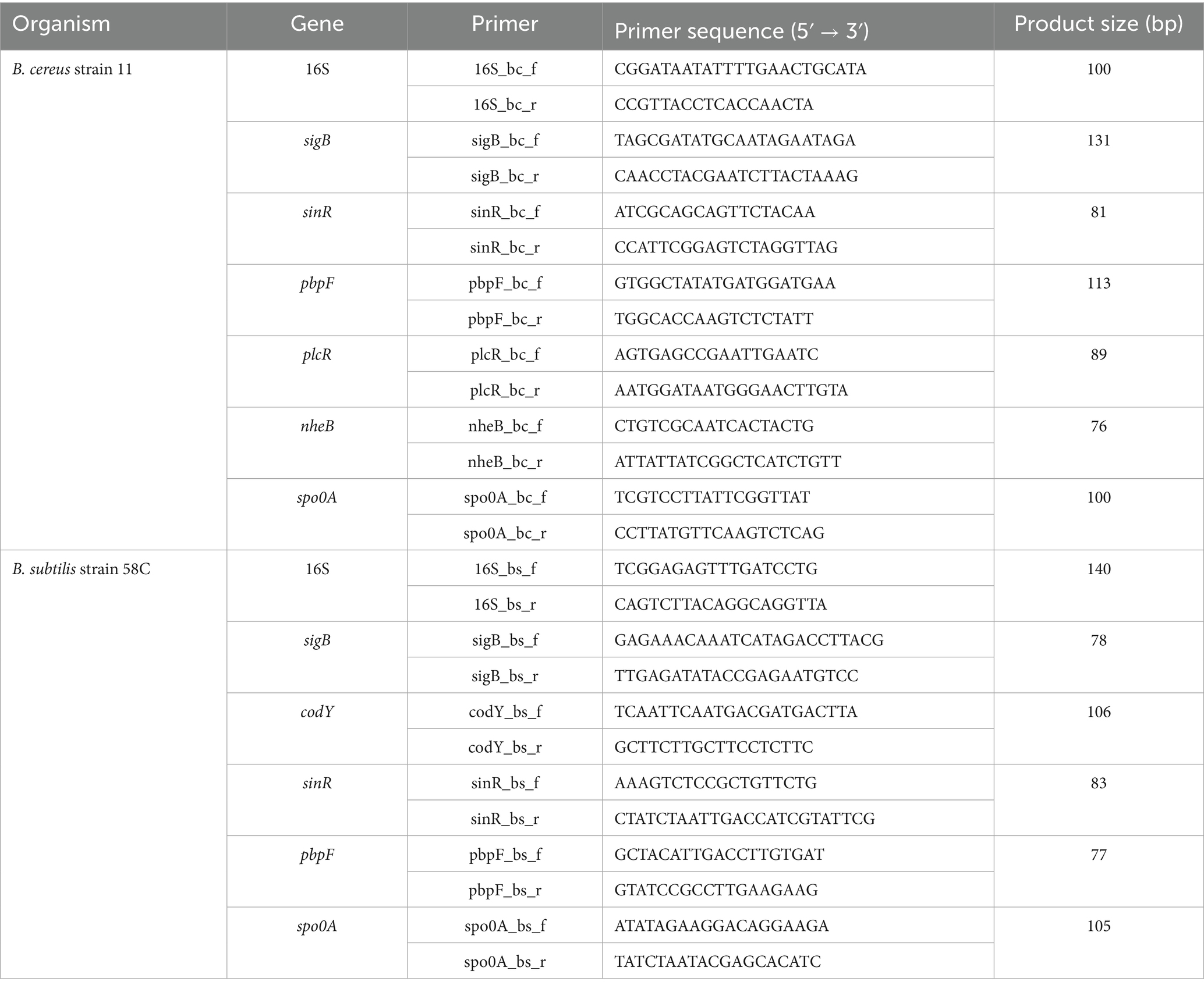 The genes used in this study, presented in Table 1, were retrieved from the literature (Fouet et al., 2000; Hecker et al., 2007; Jin et al., 2021). Their functions are summarised in Table 2. The nucleotide sequence of each gene was extracted from publicly available reference genomes at accession numbers CP020383 and CP34551. These sequences were aligned with those of B. cereus strain 11 and B. subtilis strain 58C using the Clustal Omega algorithm.1 The consensus sequences obtained for each gene harboured by both B. cereus and B. subtilis generated by the alignment study were used to design primers through Beacon Design version 7.91 (Premier Biosoft International, USA).