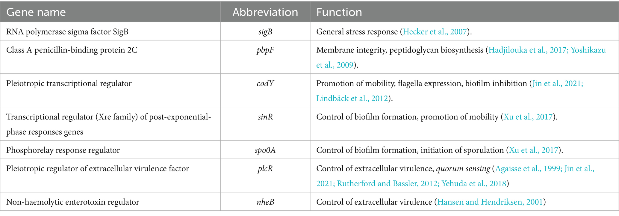 Yeak, K. Y. C., Boekhorst, J., Wels, M., Abee, T., and Wells-Bennik, M. H. (2023). Prediction and validation of novel SigB regulon members in Bacillus subtilis and regulon structure comparison to Bacillales members. BMC Microbiol. 23, 1–23. doi: 10.1186/s12866-022-02700-0