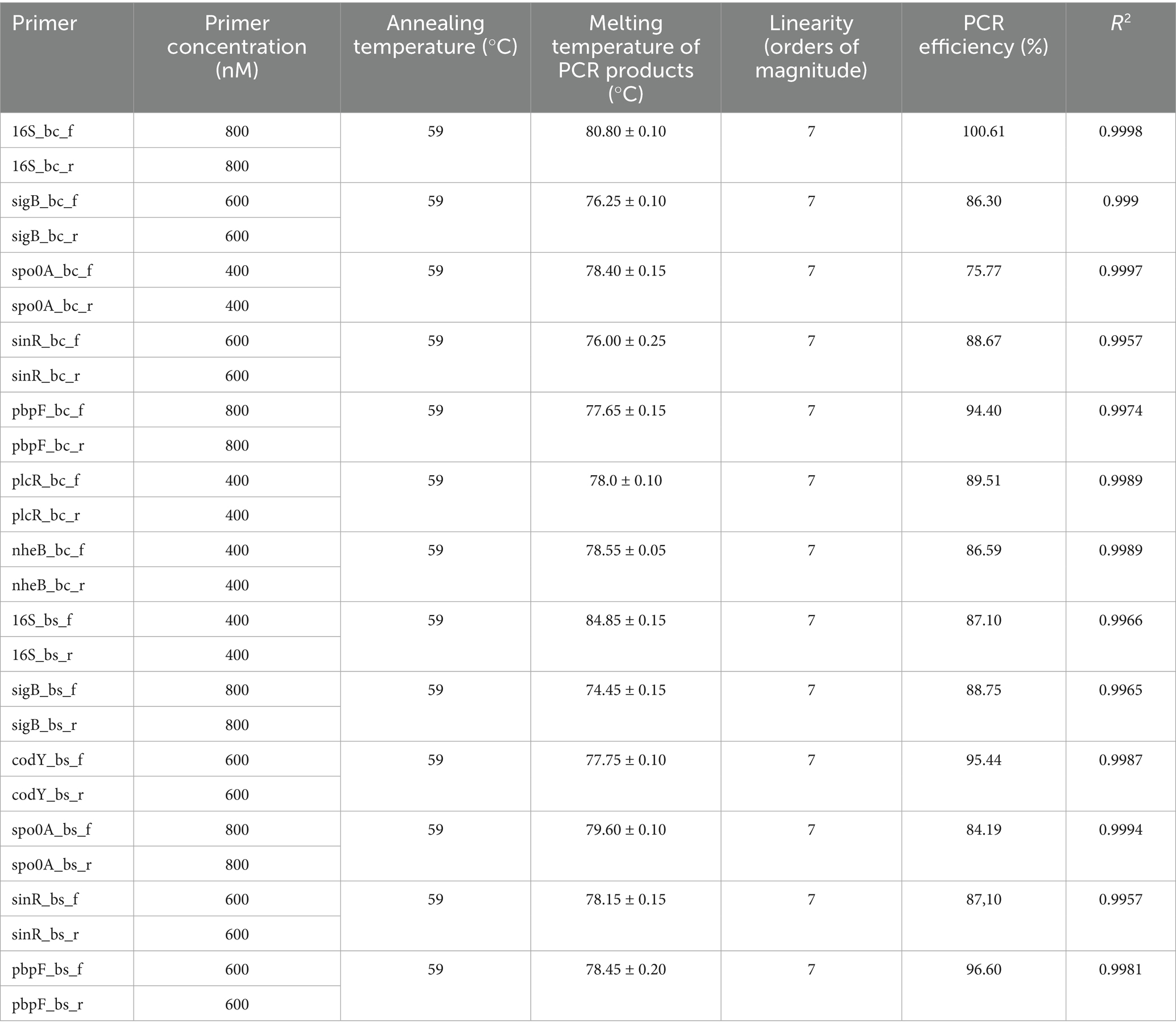 As reported in Table 3, all primer sets produced a linear response over seven orders of magnitude with PCR efficiency ranging from 84.19 to 100.61%.