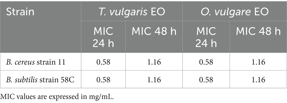 MIC values of T. vulgaris and O. vulgare EOs against B. cereus strain 11 and B. subtilis strain 58C after 24 h and 48 h of exposure are summarised in Table 4.