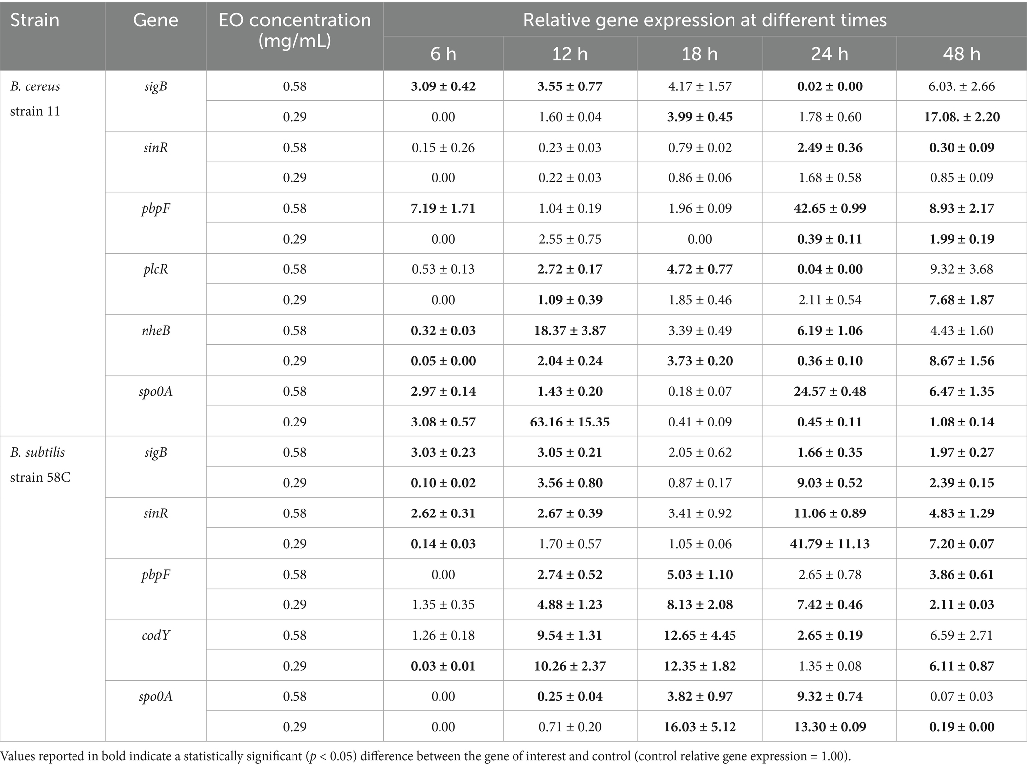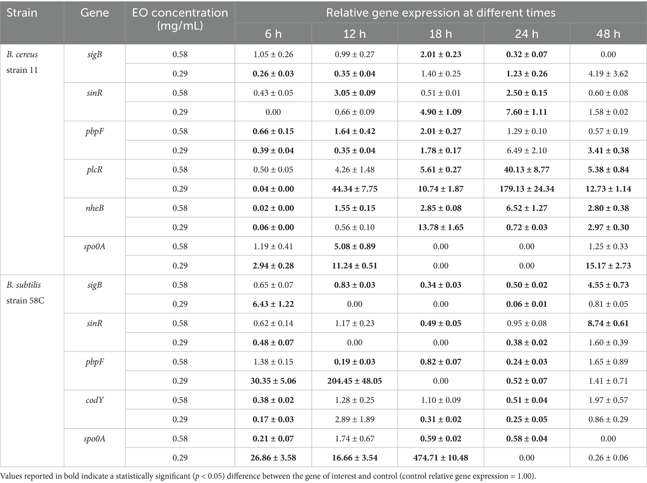 The aromatic compounds of EOs are “generally recognised as safe” (GRAS) by health food authorities (FDA (Food and Drug Administration), 2009). Due to their antimicrobial activity, they may represent promising alternatives to food preservatives and even antibiotics (Prakash et al., 2024). However, their sensory impact and the elevated cost may influence their practical application in the food industry. For this reason, the use of sublethal concentrations of EOs could be of great interest. This study aims to evaluate how Bacillus spp. strains respond at the genetic level to concentrations of EOs that are lower than the inhibitory dose. The genes sigB, sinR, pbpF, spo0A, plcR, and nheB were monitored in B. cereus strain 11, while sigB, sinR, pbpF, spo0A, and codY were observed in B. subtilis strain 58C. The effects of sub-inhibitory concentrations of EOs on these two strains were evaluated after 6, 12, 18, 24, and 48 h of exposure.