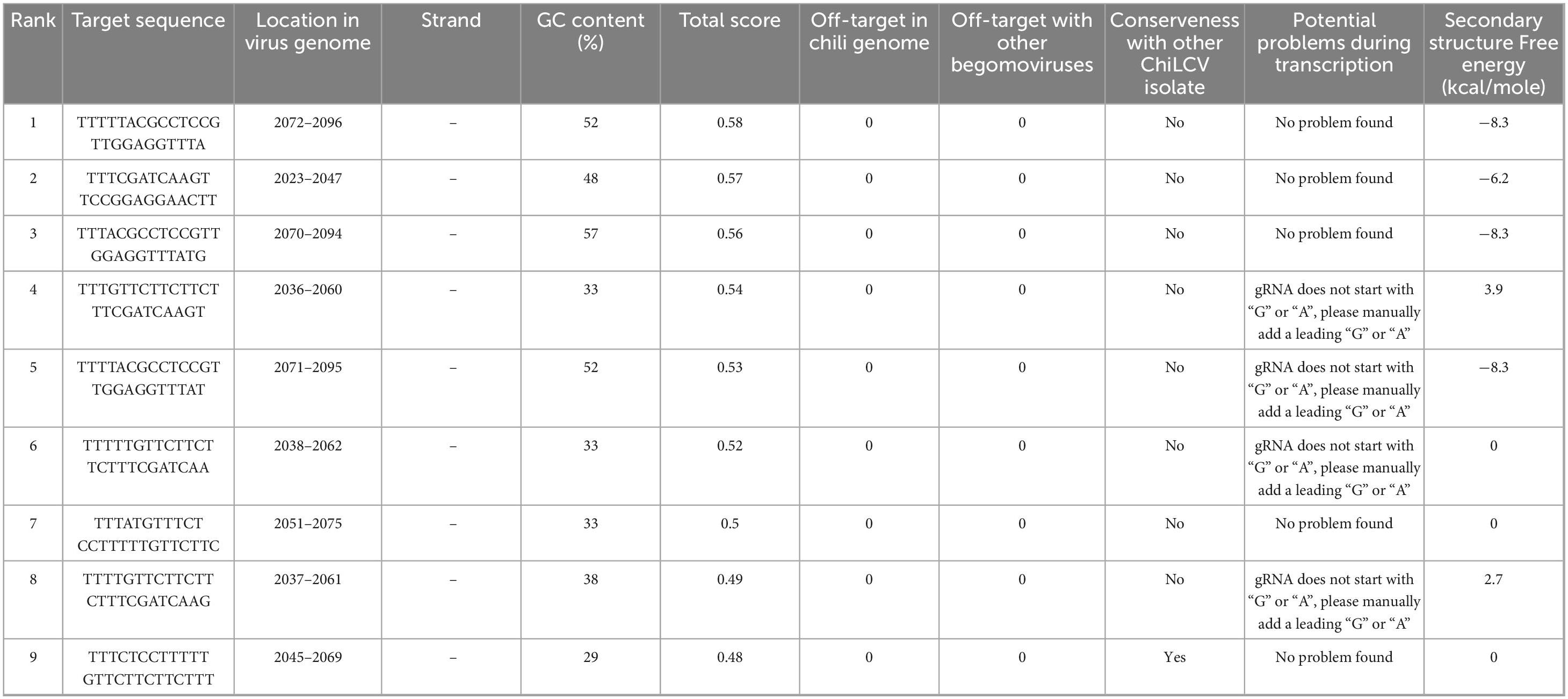 Through a comprehensive screening process, we evaluated nine potential crRNAs targeting a conserved region of the AC1 gene in ChiLCV, meticulously assessing several critical parameters as outlined in Table 1. Among the nine crRNAs, only one sequence (5′ TTTCTCCTTTTTGTTCTTCTTCTTT 3′) demonstrated significant sequence conservation across the tested ChiLCV isolates (Figure 1a). This crRNA also exhibited a favorable secondary structure lack of any hairpin structure (Supplementary Figure 1, structure 9) and displayed sequence differences in the corresponding homologous regions of closely related begomoviruses, highlighting its specificity for ChiLCV (Figure 1b).
