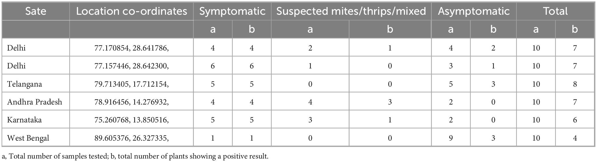A partial tandem repeat-based agroconstruct (PTR) derived from the ChiLCV Maharashtra isolate (MK882926) was employed in this study to standardize diagnostic methods, as described previously (Shilpi et al., 2015; Roy et al., 2019). For agroinoculation, the PTR construct of ChiLCV was mobilized into the Agrobacterium strain EHA105 and was grown in Luria agar for 48 h at 28 °C and then harvested in 500 μl of B5 medium. The Agrobacterium culture was prick-inoculated to young seedlings (3–4 leaf stage) of Pusa Jwala cultivar of chili, recognized for its susceptibility to ChiLCV, and grown under controlled environmental conditions (24 ± 2 °C and 70% relative humidity). In the study, cloned DNA of ChiLCV was used primarily for assay standardization, as well as for specificity and sensitivity assessments. Symptomatic leaf samples from agroinoculated plants served as the test material. However, for field validation, both symptomatic and asymptomatic chili leaf samples, as well as those suspected to be symptomatic due to virus, mite, or thrips damage, were collected from major chili-growing regions across India, including experimental research fields in New Delhi and farmers’ fields in Telangana, Andhra Pradesh, Karnataka, and West Bengal. This approach ensured a comprehensive representation of the virus strains. Ten samples were collected from each location.