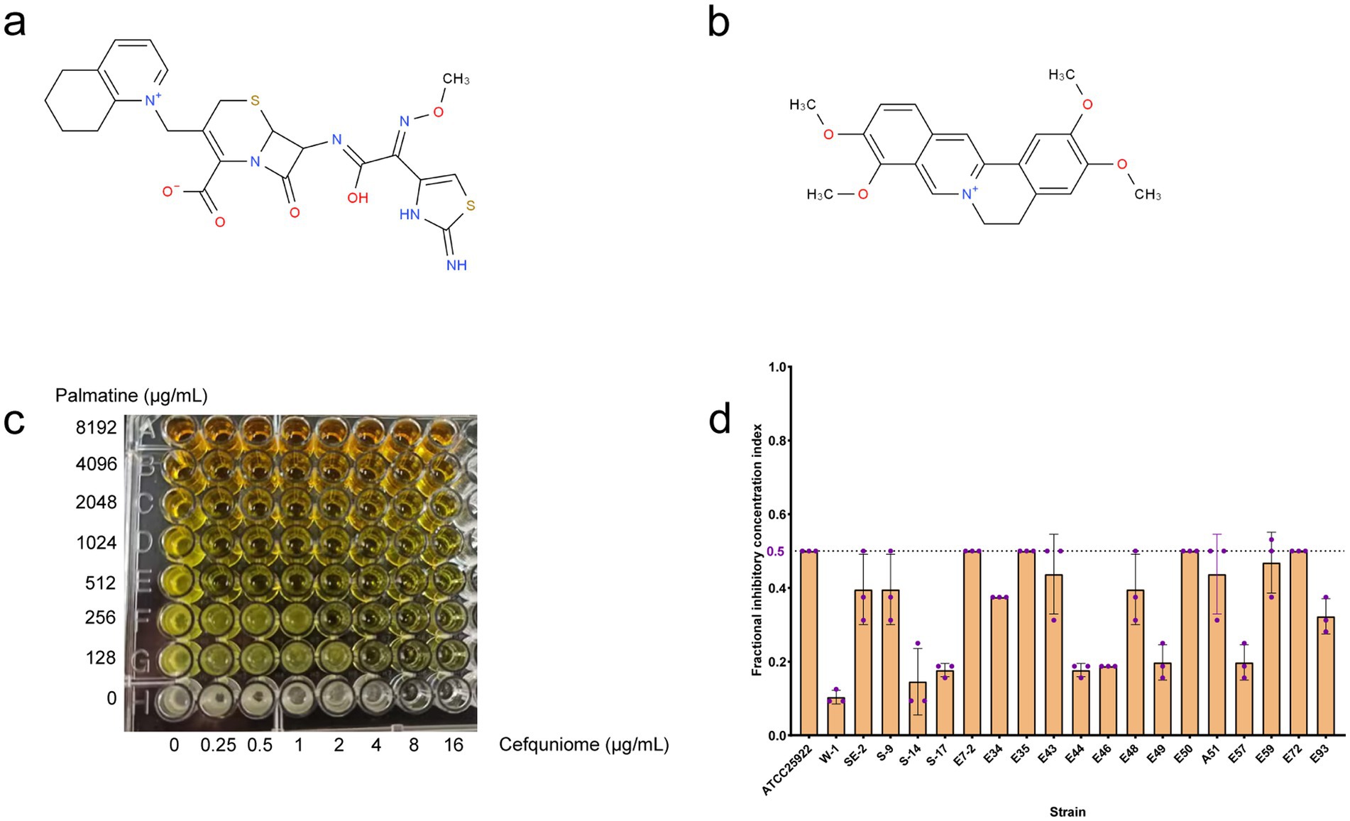 Figure 1. FIC index in tested bacterial strains. (a) Chemical structure of cefquinome. (b) Chemical structure of palmatine. (c) Synergistic effect of cefquinome and palmatine in the checkerboard assay. (d) FIC index from 20 tested strains of E. coli.