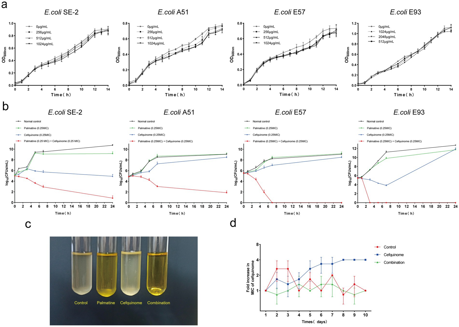 Figure 2. Palmatine improves the activity of cefquinome against E.coli. (a) Growth curve of E. coli at different subinhibitory concentrations (0.25 × MIC, 0.125 × MIC, and 0.0625 × MIC) of palmatine. (b) Time-dependent killing curve of E. coli treated with the combination of palmatine and cefquinome. E. coli was grown to the exponential phase and challenged with palmatine (0.25 × MIC) and cefquinome (0.25 × MIC) alone or in combination for 24 h. (c) The combination of palmatine (0.25 × MIC) and cefquinome (0.25 × MIC) can inhibit bacterial growth. (d) The addition of palmatine (0.25 × MIC) prevents the evolution of cefquinome resistance in E. coli E93 in vitro. Resistance is acquired during serial passaging in the presence of 0.25 × MIC levels of cefquinome (0.25 × MIC). All data are representative of three independent experiments and are shown as mean ± SD.