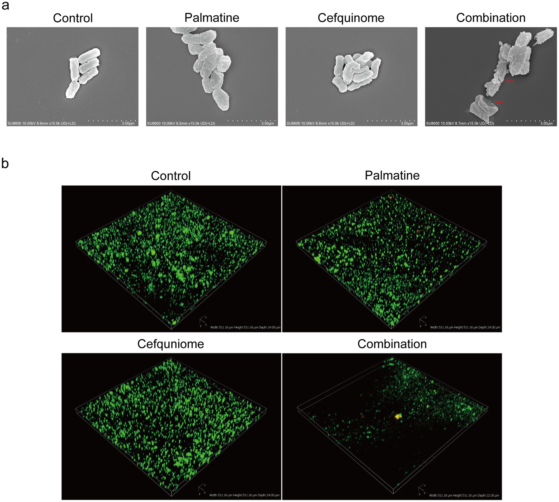 Figure 3. SEM and CLSI observation. (a) Palmatine enhances the damage caused by cefquinome to E.coli. Morphological changes in E. coli E93 treated with sub-MIC of palmatine, cefquinome, or their combination were visualized with SEM. Scale bars: 3.0 μm. (b) Three-dimensional reconstructions of 48-h E.coli biofilms were created using CLSM (200 × magnification). Red fluorescence represents dead bacteria, and green fluorescence represents live bacteria.