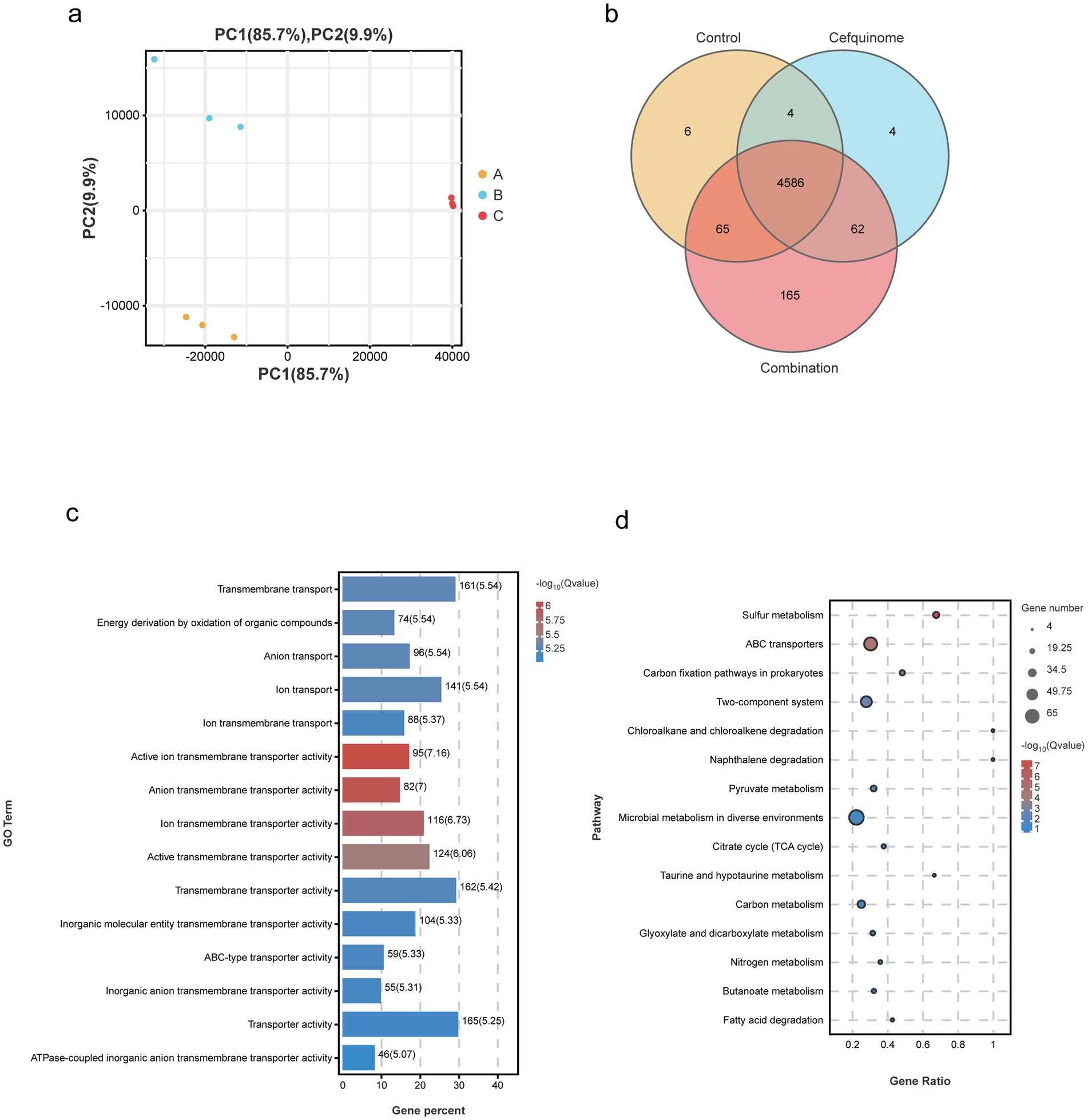 Figure 5. Transcriptomic analysis of E. coli E93 treated with no drug, palmatine, or the combination of cefquinome and palmatine. (a) Principal component analysis of different treatment groups of E. coli E93. (b) Venn diagrams showing the expressed genes in various treatment groups of E. coli E93. GO (c) and KEGG enrichment analysis (d) of the differentially expressed genes (DEGs) in E. coli E93 after exposure to no drug, cefquinome, or the combination of cefquinome and palmatine.