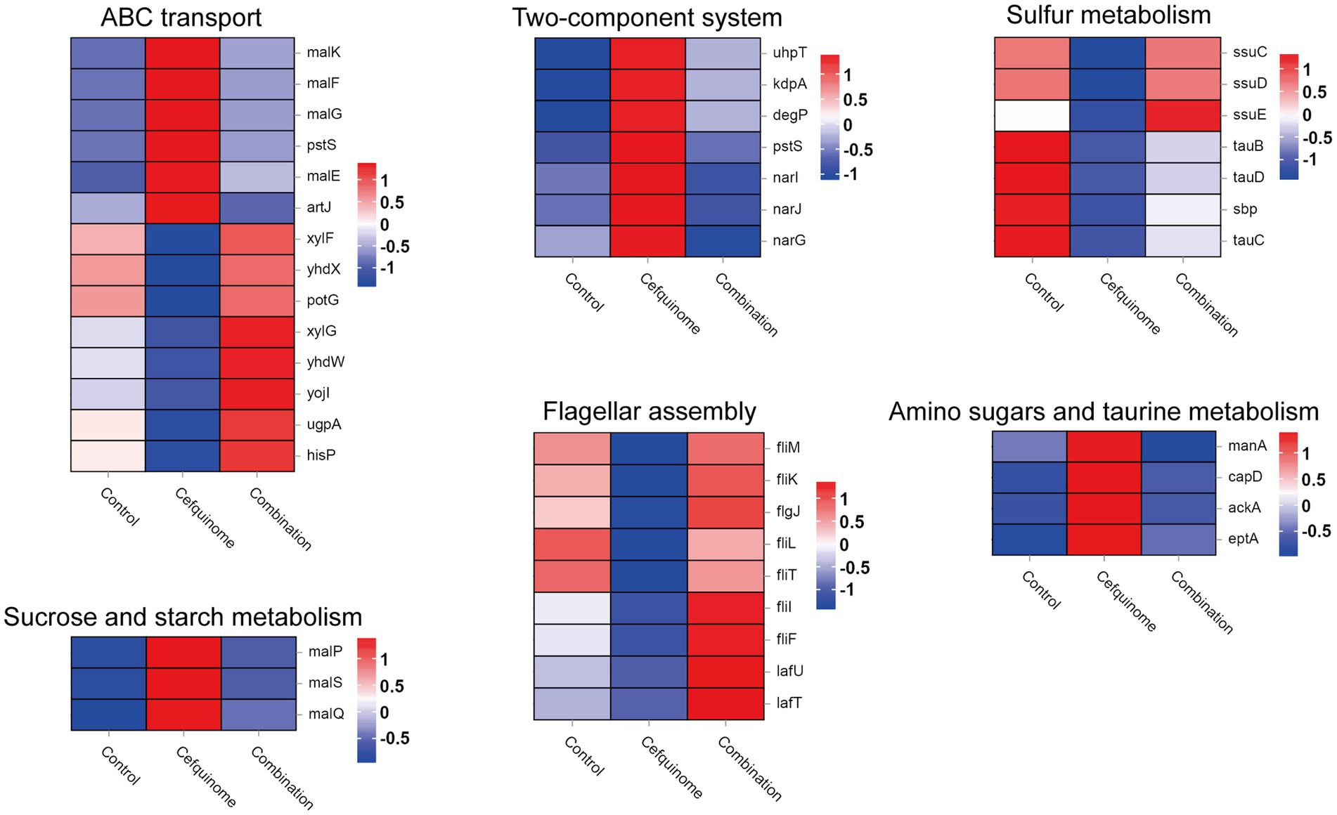 Figure 6. Transcriptomic differential gene. Filtered differentially expressed genes related to ABC transport, two-component systems, sulfur metabolism, sucrose and starch metabolism, flagellar assembly, amino sugar metabolism, and taurine metabolism. Three biological replicates were combined to produce the final data.