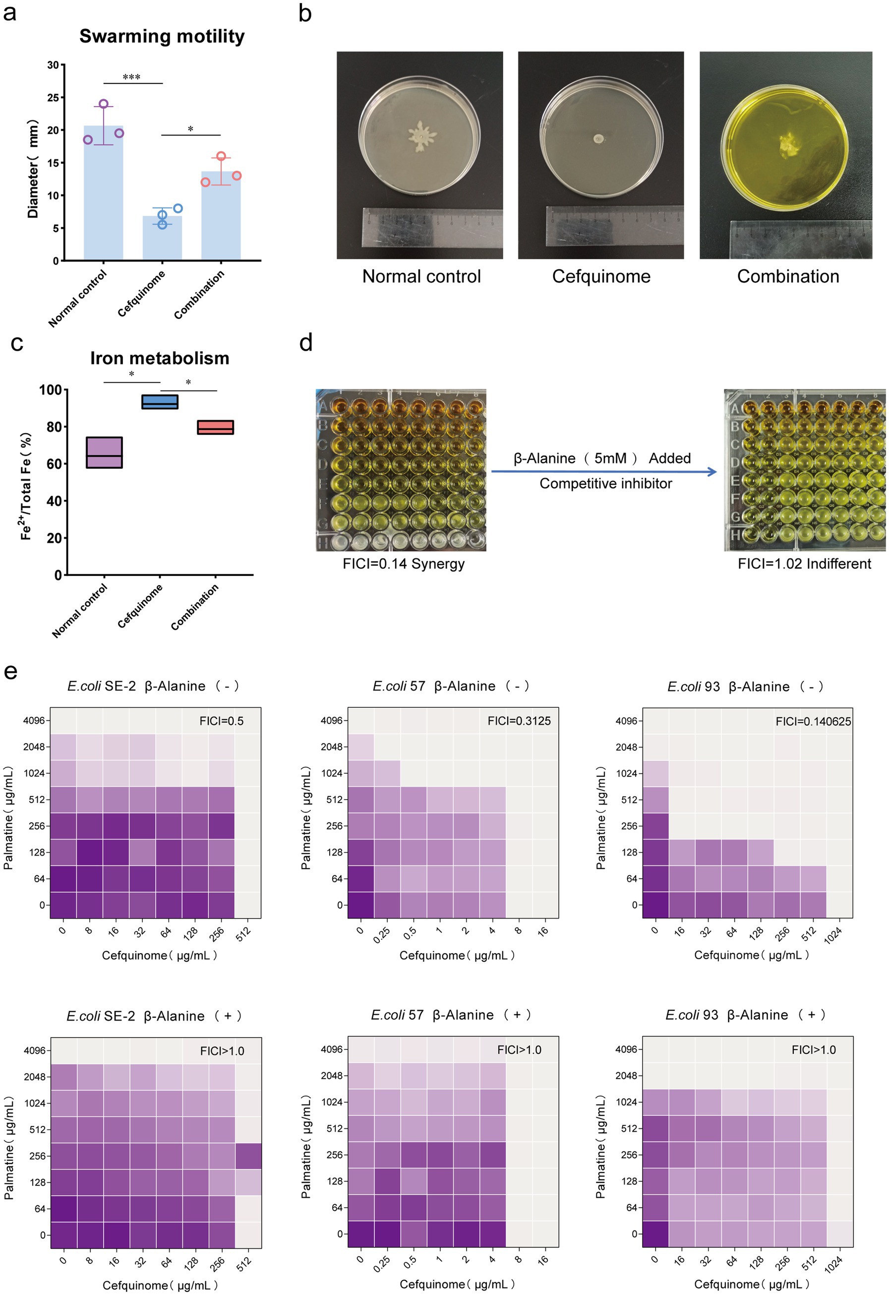 Figure 8. Phenotypic validation tests based on transcriptome sequencing. (a,b) The addition of palmatine restores the swarming motility of E. coli E93 under the stress of cefquinome. (c) The addition of palmatine restores the iron metabolism level (Fe2+ /total Fe) of E. coli E93 under the cefquinome stress. (d) The addition of taurine transport inhibitors (β-Alanine) eliminates the synergistic effect of palmatine and cefquinome. All experiments were performed with biological replicates and presented as mean ± SD. Concentrations of palmatine, cefquinome, or combination drugs were at 0.25 MIC. One-way ANOVA among multiple groups was used to calculate p-values (*p < 0.05, **p < 0.01, ***p < 0.001). (e) Checkerboard broth microdilution assays between palmatine and cefquinome against E. coli SE-2, E. coli E57, and E. coli E93 in the presence or absence of β-alanin. The mean OD at 600 nm of three biological replicates is presented.