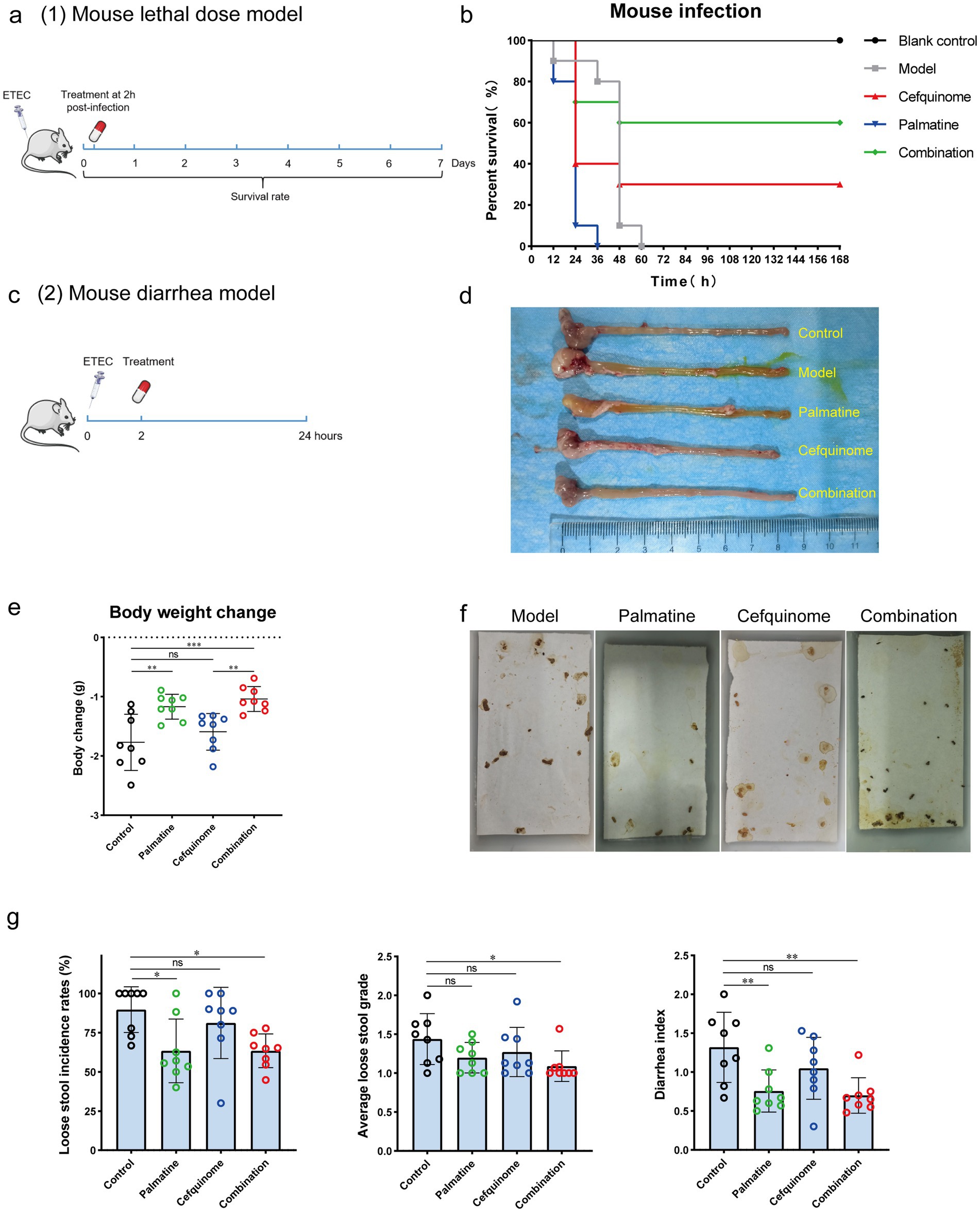 To evaluate the in vivo therapeutic potential of the palmatine-cefquinome combination, we established two murine models using E. coli 57 (ETEC): a systemic infection model (Figure 9a) and an ETEC diarrhea model (Figure 9c).