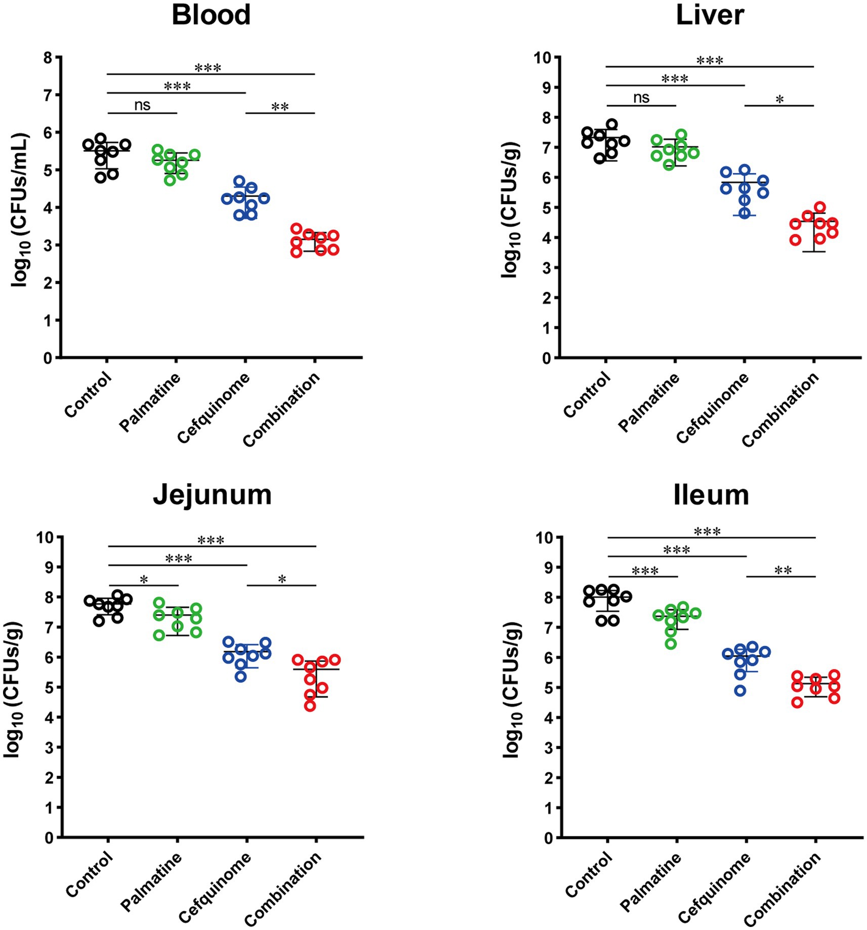 Mice in different groups were treated with the following treatments: cefquinome (5 mg/kg−1 of body weight, intraperitoneal injection), palmatine (10 mg/kg−1 of body weight, oral gavage), control treatment (intraperitoneal injection and oral gavage with an equal volume of sterile saline), and combination therapy administered 2 h after infection. The mice’s weights were recorded before and 24 h after infection. At 24 h after infection, blood samples were collected simultaneously from the orbit. The mice were anesthetized with Avertin (30 μl /g body weight) (DOWOBIO, Shanghai, China) and euthanized. Liver and intestine samples were then collected.