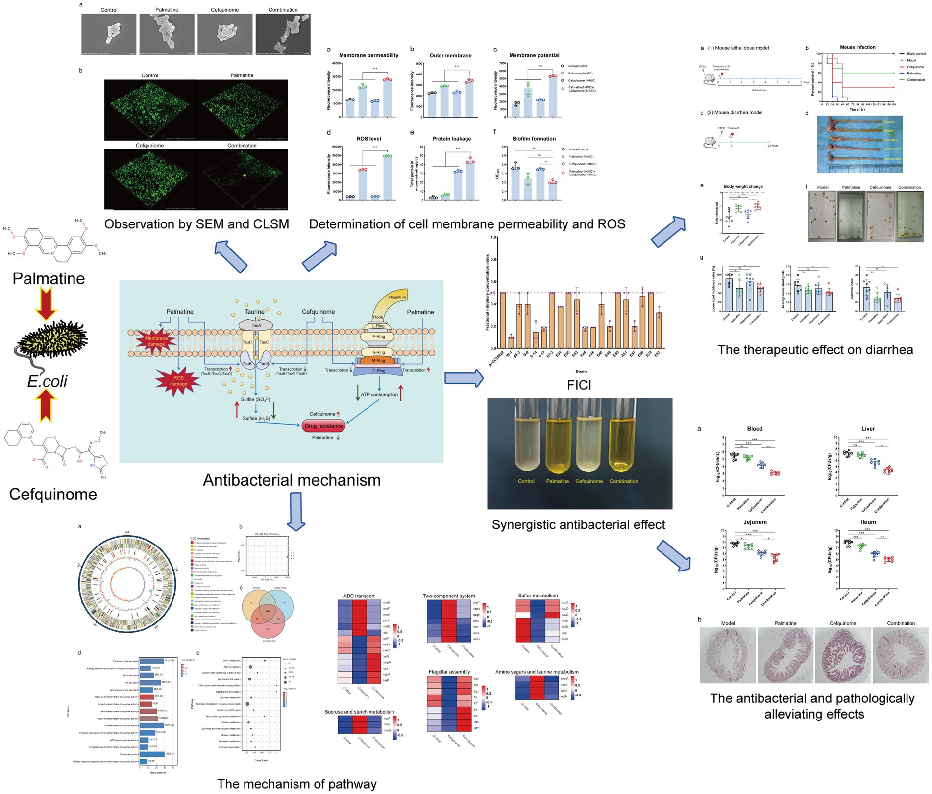 In this study, we report that palmatine broadly enhances the antibacterial activity of cefquinome against clinically isolated Escherichia coli by regulating sulfur/taurine metabolism and oxidative stress. Palmatine improves survival rates and significantly reduces diarrhea symptoms in a murine model of Enterotoxigenic Escherichia coli (ETEC) infection. These findings position palmatine as a multi-target adjuvant capable of overcoming cefquinome resistance, offering a promising strategy for combating multidrug-resistant Gram-negative infections.