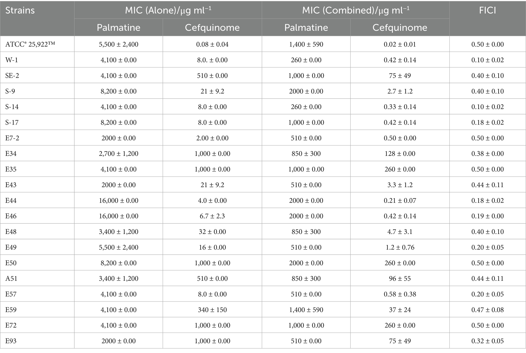 Cefquinome MICs of clinical isolates ranged from 2 to 1,024 μg/ml−1, and palmatine MICs ranged from 2,048 to 16,384 μg/ml−1 (Table 1). The MICs of cefquinome and palmatine for ATCC25922 were 0.08 ± 0.04 μg/ml−1 and 5461.33 ± 2364.83 μg/ml−1 (Table 1). Checkerboard assays revealed synergistic effects (FICI ≤ 0.5) among all 20 strains, with cefquinome MICs reduced by≥ 4-fold (Figure 1d). The mean FICI range was 0.10–0.50, demonstrating consistent potentiation across the tested strains.