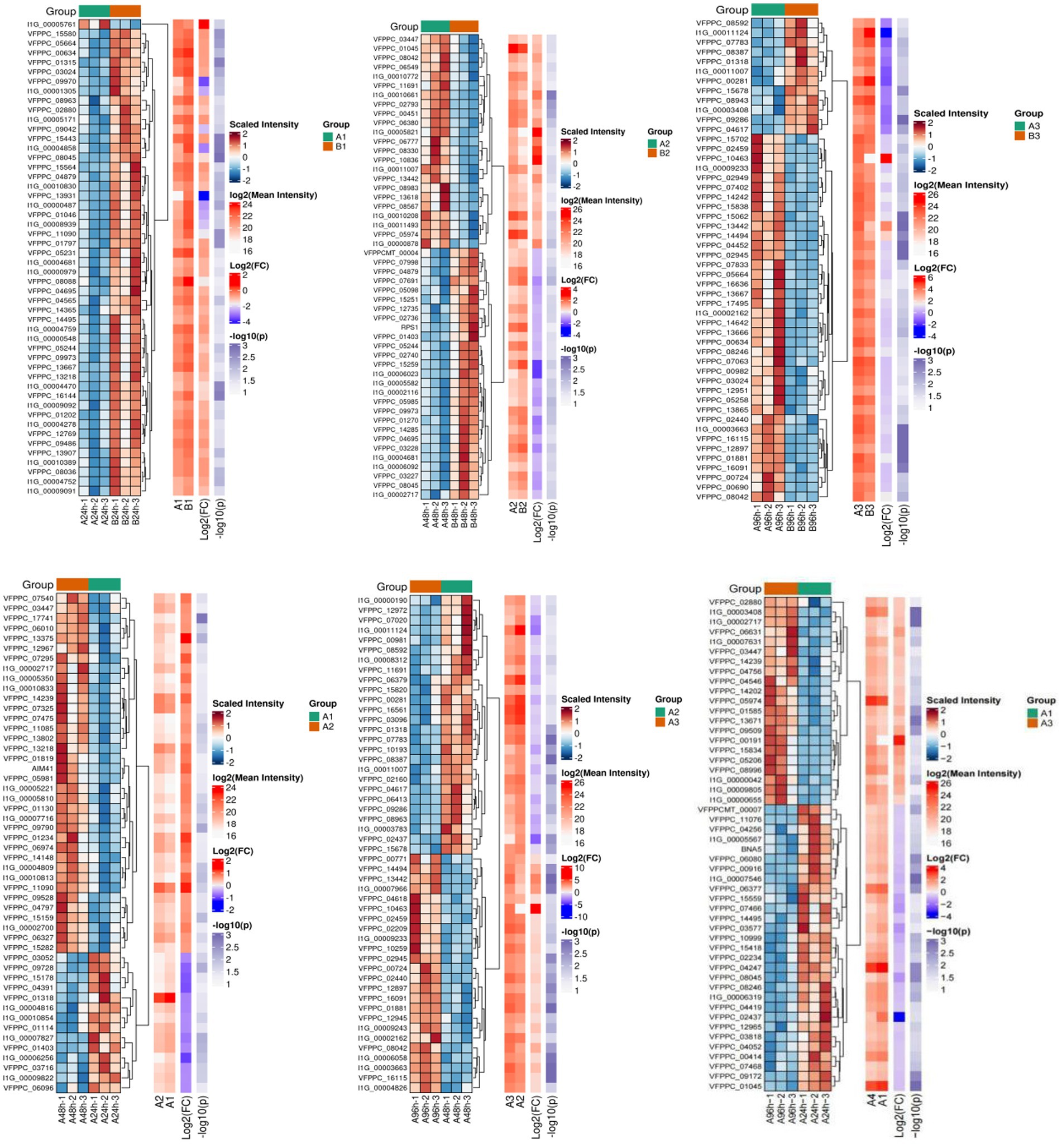 Proteomic analysis of different infestation periods of P. chlamydosporia on the eggs of Parascaris equorum was performed using the DIA technique, and the mycelial proteins induced by Parascaris equorum (Group A) and sterile water (Group B) at different infestation stages of the egg-parasitic fungus P. chlamydosporia were analyzed. The results revealed 8,875 proteins, 108,118 peptides, 106,902 peptides, and 80,742 unique peptides (Table 1 and Figure 2). Proteins that met the screening criteria of an expression difference greater than 1.5-fold (up- and downregulated) and a p < 0.05 were regarded as significant DEPs. The number of DEPs in each group is presented in Table 1. Data analysis revealed that 1,597, 245, and 607 proteins showed differential abundance from 0 to 24 h, 24 to 48 h, and 48 to 96 h, respectively. The proteome of the mycelia induced by eggs of Parascaris equorum showed 655 DEPs at 24 h in comparison with the findings in the control group (group B) induced by sterile water. Among these proteins, 309 were upregulated and 346 were downregulated. At 48 h, 353 DEPs were identified, of which 196 were upregulated and 157 were downregulated. At 96 h, 790 DEPs were identified, of which 508 were upregulated and 282 were downregulated. These results indicated that protein expression in mycelia induced by Parascaris equorum egg extracts differed from that in the control, indirectly suggesting major changes in the physiological activity of the fungus. Analysis of the processes in 24-h (A1/B1), 48-h (A2/B2), and 96-h (A3/B3) samples from both groups revealed that the highest scores were recorded for chitinase, lipase, serine protease, glucanase, pectinase, and cellulase, which are distinct protein hydrolases that may be associated with the process of infestation of the eggs of Parascaris equorum. These distinct proteases may contribute to the virulence of the fungus in the pathogens and promote the colonization of the eggs.