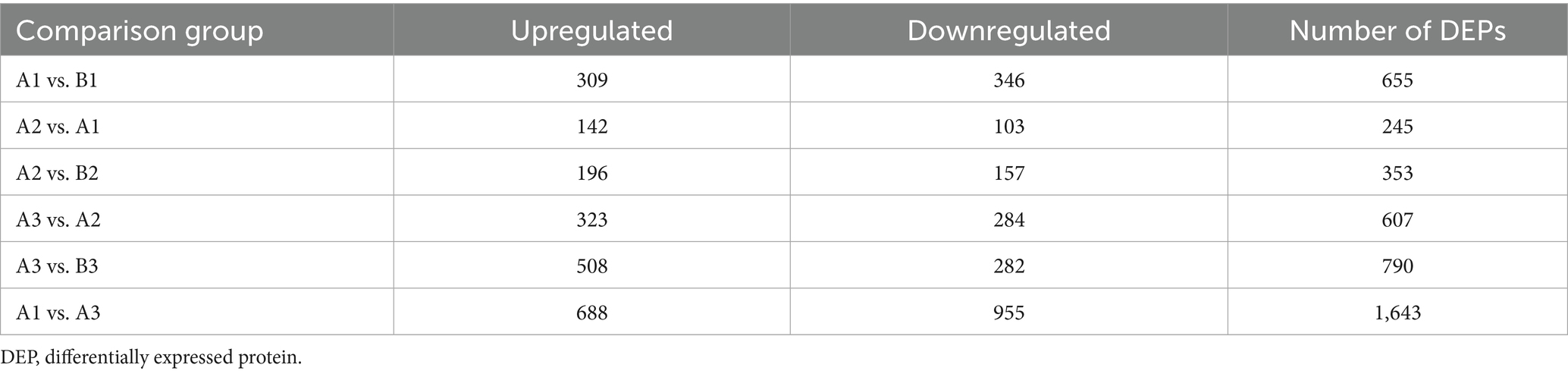 Bioinformatics analysis was performed using Microsoft Excel and R statistical computing software. Sequence annotation information was obtained from UniProtKB/SwissProt, Kyoto Encyclopedia of Genes and Genomes (KEGG), and the Gene Ontology (GO) database. To ensure the validity and accuracy of the subsequent raw letters and statistical analyses, in accordance the general principle, in the protein identification form, we first screened the sample experimental data to ensure that at least 50% of the identified proteins corresponding to the sample groups were retained without null-value data, and then filled the data with the remaining null values and performed the statistical analyses, which were performed with the default use of the t-test (Student’s t-test) combined with the method of fold change (FC, the ratio of the mean value of expression between the two groups). Differentially expressed proteins (DEPs) were screened out by identifying proteins that met the screening criteria of expression difference greater than 1.5-fold (upward and downward adjustments) and a p < 0.05, and the DEPs were subjected to GO and KEGG enrichment analysis using Fisher’s exact test with FDR correction for multiple testing. The enriched GO and KEGG pathways were statistically significant at p < 0.01 according to Fisher’s exact test.