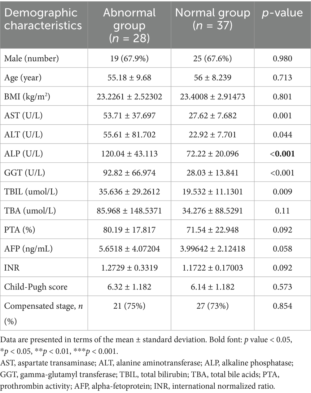 Baseline demographic and clinical characteristics—including age, BMI, sex distribution, prothrombin time activity (PTA), alpha-fetoprotein (AFP) levels, and Child-Pugh classification—demonstrated no significant intergroup differences (all p > 0.05), indicating well-matched cohorts. Notably, the abnormal enzyme group displayed significantly elevated serum biomarkers of hepatic injury compared to controls: Aspartate aminotransferase (AST; p = 0.001), alanine aminotransferase (ALT; p = 0.044), gamma-glutamyl transferase (GGT; p < 0.001), alkaline phosphatase (ALP; p < 0.001), total bilirubin (TBIL; p = 0.009).