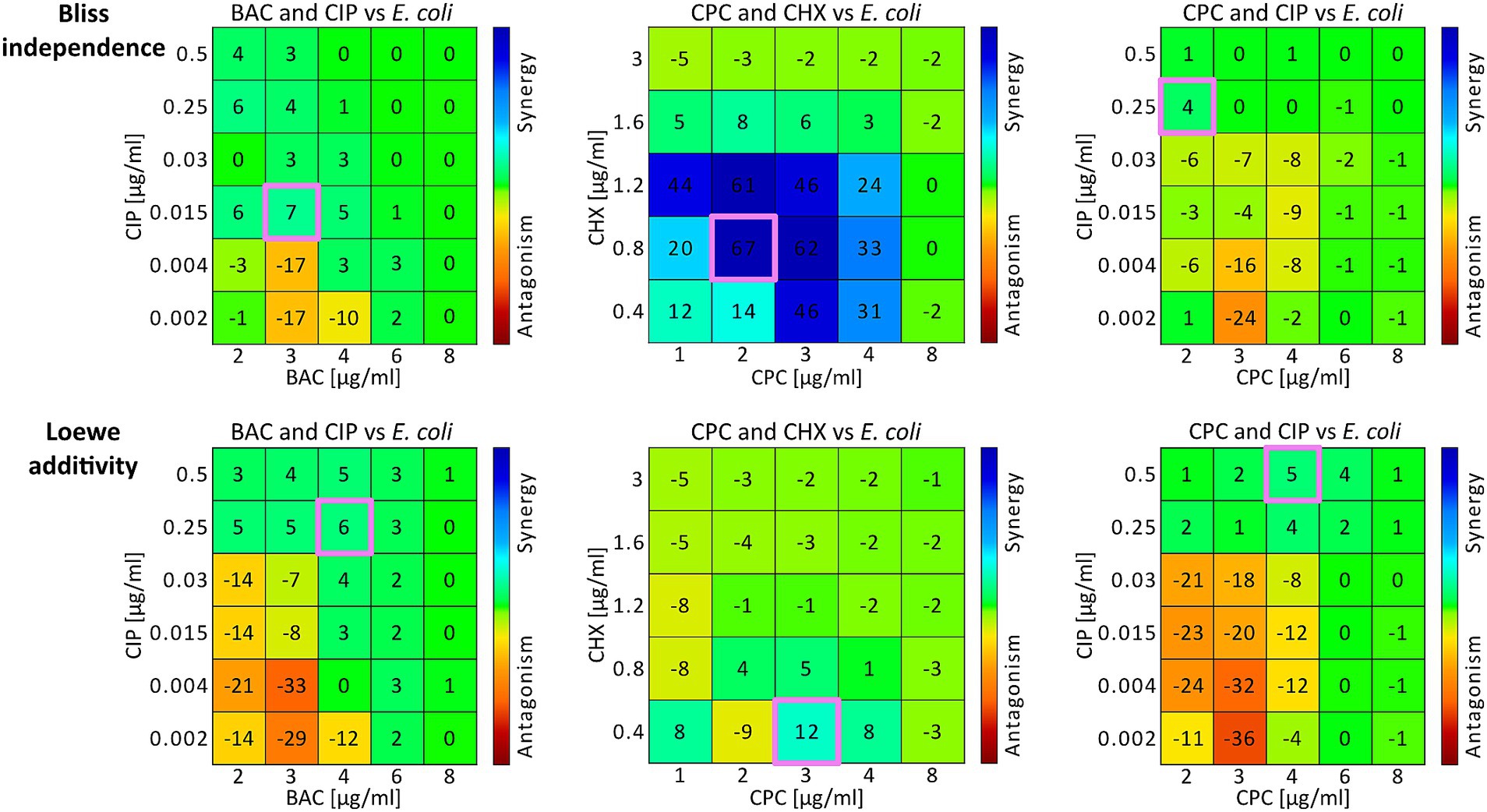 Figure 1. Synergy matrices and concentration pairs at maximum synergy from E. coli experiments. Three examples are illustrated using the combinations BAC and CIP (left column), CPC and CHX (middle column), and CPC and CIP (right column) against E. coli. The two rows present the Combenefit synergy matrices for Bliss independence (top row) and Loewe additivity (bottom row), displaying drug combinations with marked areas indicating specific interaction values. The color gradient represents synergy (blue) to antagonism (red). The concentration pairs at maximum synergy for both models are each highlighted in pink (Table 2). For Bac and CIP (left column) the synergy scores were 0.5 for Bliss independence and −2.2 for Loewe additivity. For CPC and CHX (middle column) the synergy scores were −3.1 for Bliss independence and −6.8 for Loewe additivity. For CPC and CIP (right column) the synergy scores were 9.4 for Bliss independence and −0.2 for Loewe additivity (Table 2).