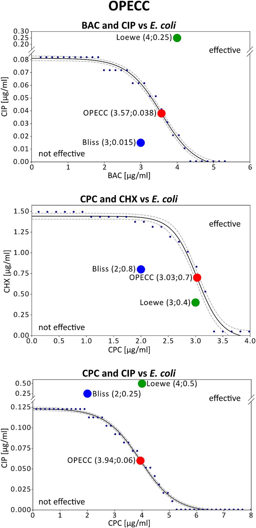 Figure 2. Concentration pairs at maximum synergy and OPECCs from E. coli experiments. The three potential outcomes are illustrated using the combinations BAC and CIP (top), CPC and CHX (middle), and CPC and CIP (bottom) against E. coli. Displayed is the curve separating the effective from the not effective concentrations (solid line), that was used to calculate the OPECC (red dot: inflection point), along with the corresponding concentration pairs at maximum synergy based on Bliss independency (blue dot) and Loewe additivity (green dot). The same combinations of compounds were depicted in Figure 1 and Figure 2. The concentration pairs at maximum synergy used here are highlighted pink in Figure 1. The OPECC curve (solid line) was fitted using a four-parameter sigmoid model in TableCurve 2D, following previously established protocols (Hiller et al., 2023). The goodness of fit r2 was higher than 0.984, and 90% confidence intervals were determined (dashed lines). BAC and CIP (top): The Bliss independence concentration pair at maximum synergy is not effective, located at the bottom left of the curve. For Loewe additivity the concentration pair is effective but positioned at the top right of the curve, making it not optimal (a reduction in one or both compounds may still achieve an antibacterial effect). CPC and CHX (middle): In this instance, both models resulted in not effective concentration pairs at maximum synergy. CPC and CIP (bottom): Both models resulted in effective but not optimal concentration pairs at maximum synergy.