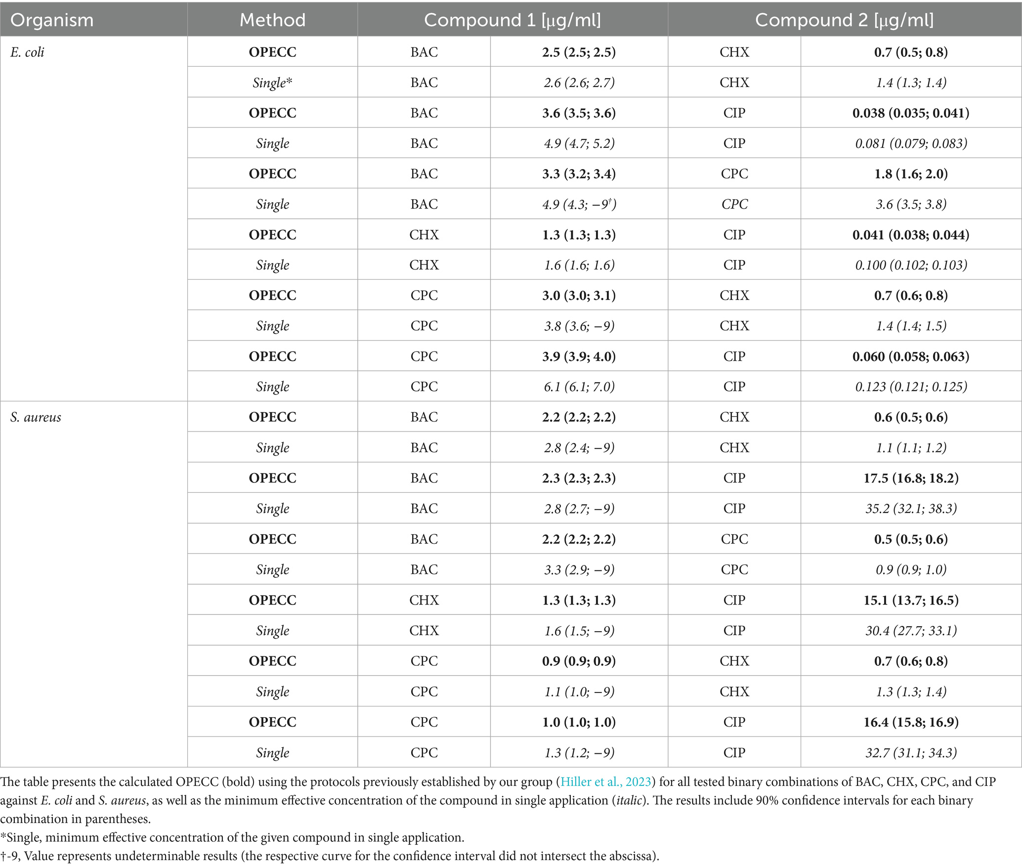 Table 1. The OPECC for all binary combinations of BAC, CHX, CPC, and CIP against E. coli and S. aureus.