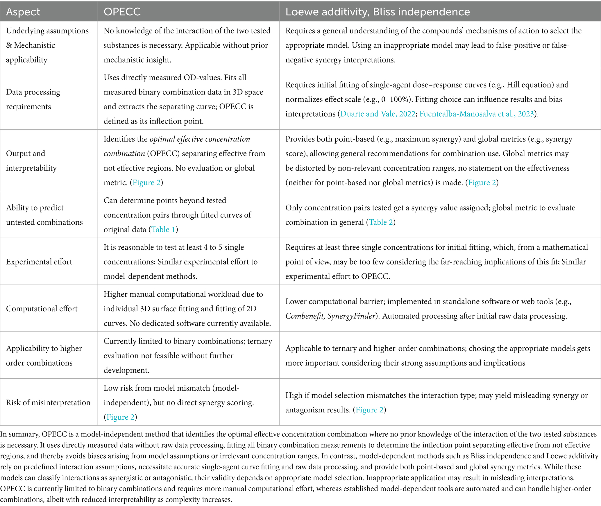 Conclusion: The comparison demonstrated that the assumptions like “additivity” or “independence” underlying these models can result in concentration pairs at maximum synergy that may not necessarily be effective. As a consequence, the synergy evaluation methods tested do not account for the effectiveness of the assessed concentration pairs. In contrast, the model-independent OPECC method identifies effective concentration combinations directly from experimental data, without reliance on interaction assumptions or further data processing. The separating curve is based on directly measured optical density (OD) values of the binary concentration combinations, thus representing the real situation. By offering an alternative or complementary approach to existing models, the OPECC method may support more accurate identification of effective antimicrobial combinations and provide valuable insights for the development of optimized treatment strategies in the context of rising antimicrobial resistance.