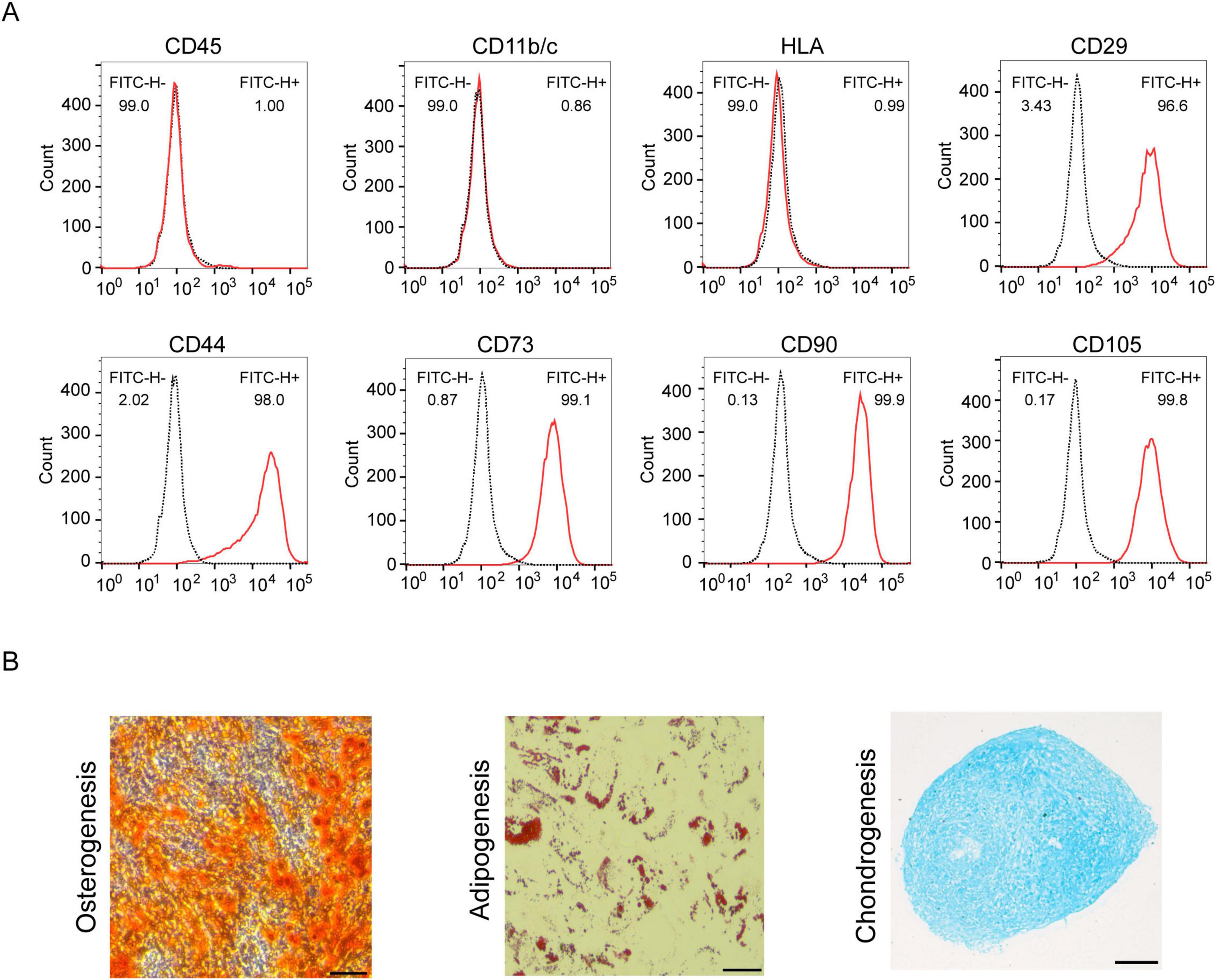 Figure 1. Identification of HUC-MSCs. (A) Cells were analyzed by flow cytometry with the following antibodies: anti-CD11b/c, anti-CD45, anti-HLA, anti-CD29, anti-CD44, anti-CD73, anti-CD90, and anti-CD105. (B) Determination of the potential of HUC-MSCs for adipogenic, chondrogenic and osteogenic differentiation (scale bar: 100 μm).