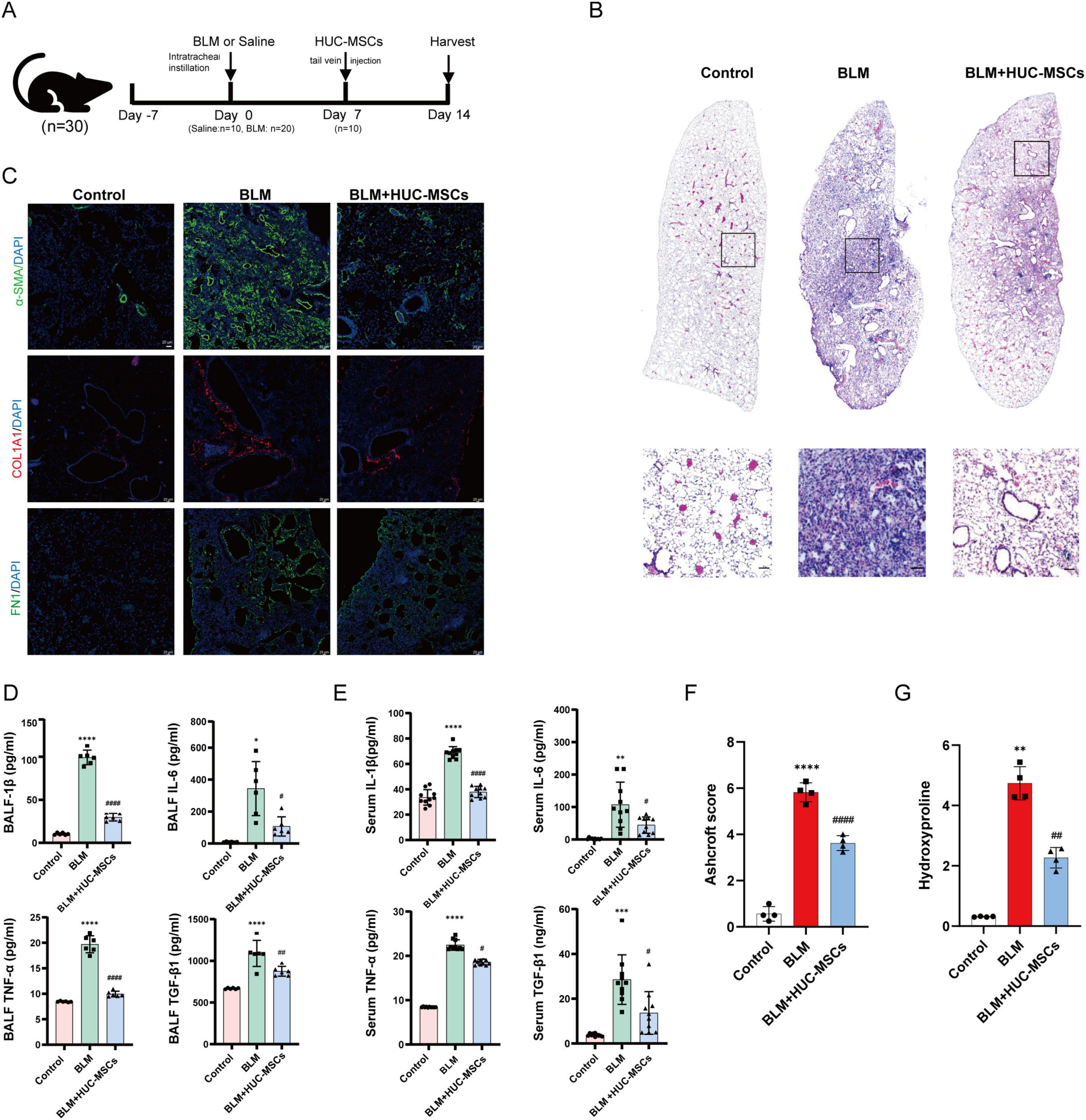 Figure 2. Human umbilical cord-derived mesenchymal stem cells (HUC-MSCs) alleviated the severity of BLM-induced IPF in model mice. (A) Experimental design and model schematic. (B) Representative HE-stained lung sections from mice (scale bar: 50 μm). (C) Representative images of immunofluorescence staining and the expression of α-SMA, FN1 and COL1A1 in lung tissues (scale bar: 20 μm). (D,E) The concentrations of IL-1β, IL-6, TNF-α and TGF-β1 in bronchoalveolar lavage fluid (BALF) and serum were evaluated with ELISA kits. (F) Ashcroft score. (G) The concentrations of Hydroxyproline. The data are shown as the means ± SDs (Figure 1D, n = 6; Figure 1E, n = 10; Figure 1F, n = 4) (*p < 0.05, **p < 0.01, ***p < 0.001, ****p < 0.0001 BLM vs. Control; #p < 0.05, ##p < 0.01, ###p < 0.001, ####p < 0.0001 vs. BLM).