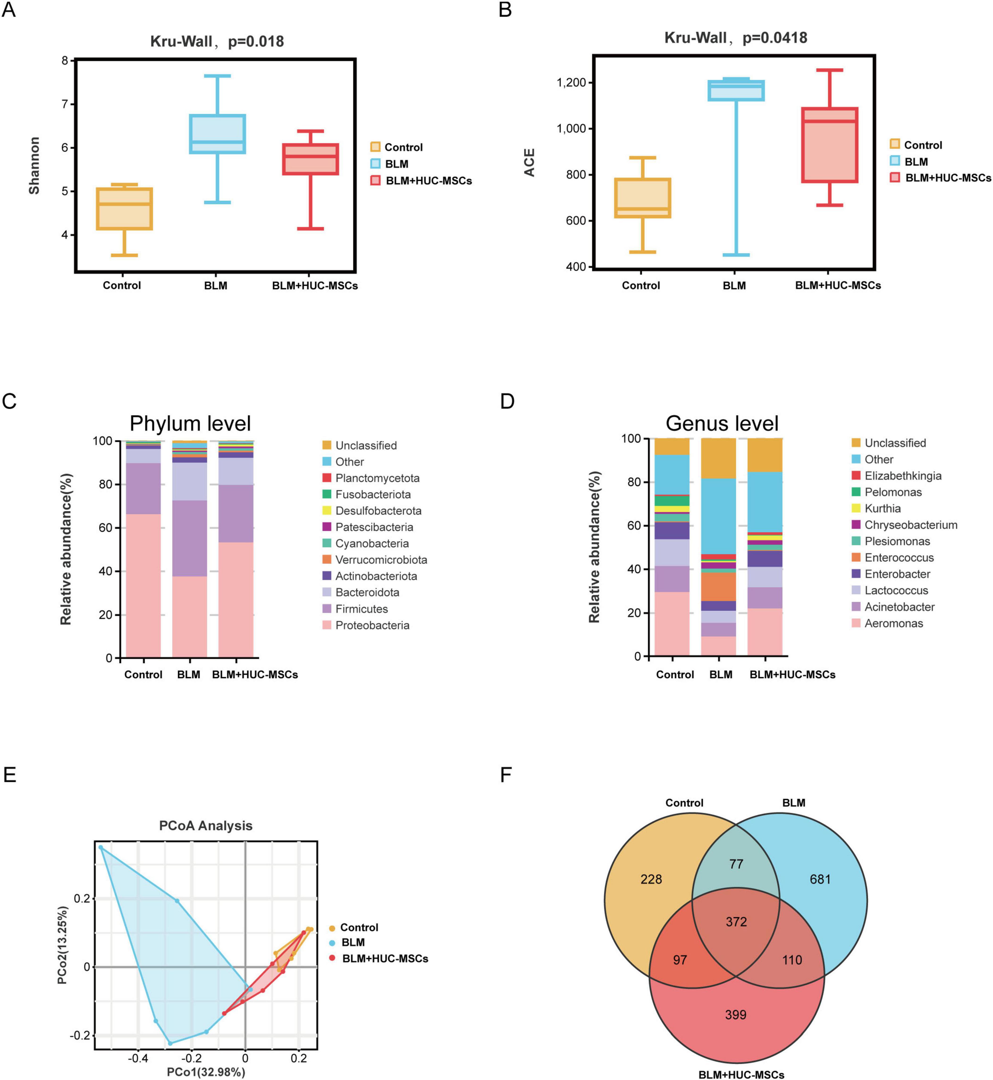 Figure 3. Human umbilical cord-derived mesenchymal stem cells (HUC-MSCs) therapy altered the lung microbiota composition in BLM-induced IPF model mice. (A) Shannon richness index of the lung microbiota. (B) ACE richness index of the lung microbiota. (C) Relative abundances of bacterial taxa in all the groups at the phylum level. (D) Relative abundances of bacterial taxa in all the groups at the genus level. (E) PCoA plot of microbial communities at the OTU level. (F) Venn diagram showing the distribution of operational taxonomic units (OTUs) among different groups. The data are shown as the means ± SDs (n = 6 for all the groups).